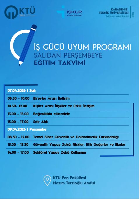Eğitim programı kapsamında, Karadeniz Teknik Üniversitesi İktisadi ve İdari Bilimler Fakültesi öğretim üyesi Prof. Dr. Hüseyin Sabri KURTULDU tarafından "Kişiler Arası İlişkiler ve Etkili İletişim", Karadeniz Teknik Üniversitesi Tıp Fakültesi öğretim üyesi Prof. Dr. Murat TOPBAŞ tarafından "Bağımlılıkla Mücadele", Karadeniz Teknik Üniversitesi Sıfır Atık Koordinatörlüğü personeli Çevre Mühendisi Hasan ATEŞ tarafından "Sıfır Atık" eğitimi ve T.C. Cumhurbaşkanlığı Uzaktan Eğitim Kapısı üzerinden "Bireyler Arası İletişim" eğitimleri 07.04.2026; Trabzon Emniyet Müdürlüğü Suç Araştırma ve Soruşturma Uzmanı İlhan TOZLUYURT tarafından "Temel Siber Güvenlik ve Dolandırıcılık Farkındalığı" ve T.C. Cumhurbaşkanlığı Uzaktan Eğitim Kapısı üzerinden "Güvenilir Yapay Zekâ: Riskler, Etik Değerler ve İlkeler", "Sektörel Yapay Zekâ Kullanımı" eğitimleri 09.04.2026 tarihinde 08.30 – 17.00 saatleri arasında KTÜ Nazım Terzioğlu Amfisi’nde gerçekleştirilecektir.