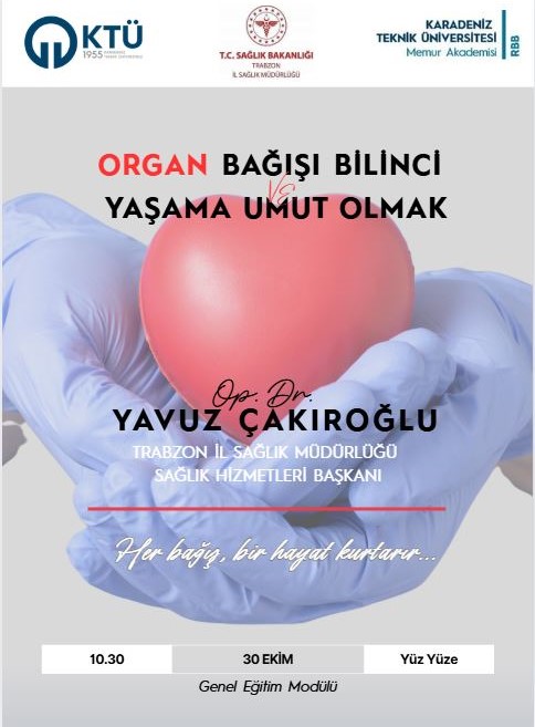 Trabzon İl Sağlık Müdürlüğü ile Personel Daire Başkanlığı (Planlama, Eğitim ve Performans Şube Müdürlüğü) iş birliği çerçevesinde, Trabzon İl Sağlık Müdürlüğü Sağlık Hizmetleri Başkanı Op. Dr. Yavuz ÇAKIROĞLU tarafından tüm personelimize yönelik olarak “Organ Bağışı Bilinci ve Yaşama Umut Olmak” konulu eğitim, 30.10.2025 Perşembe günü saat 10.30’ da KTÜ Fen Fakültesi Nazım Terzioğlu Amfisi'nde gerçekleştirilecektir.