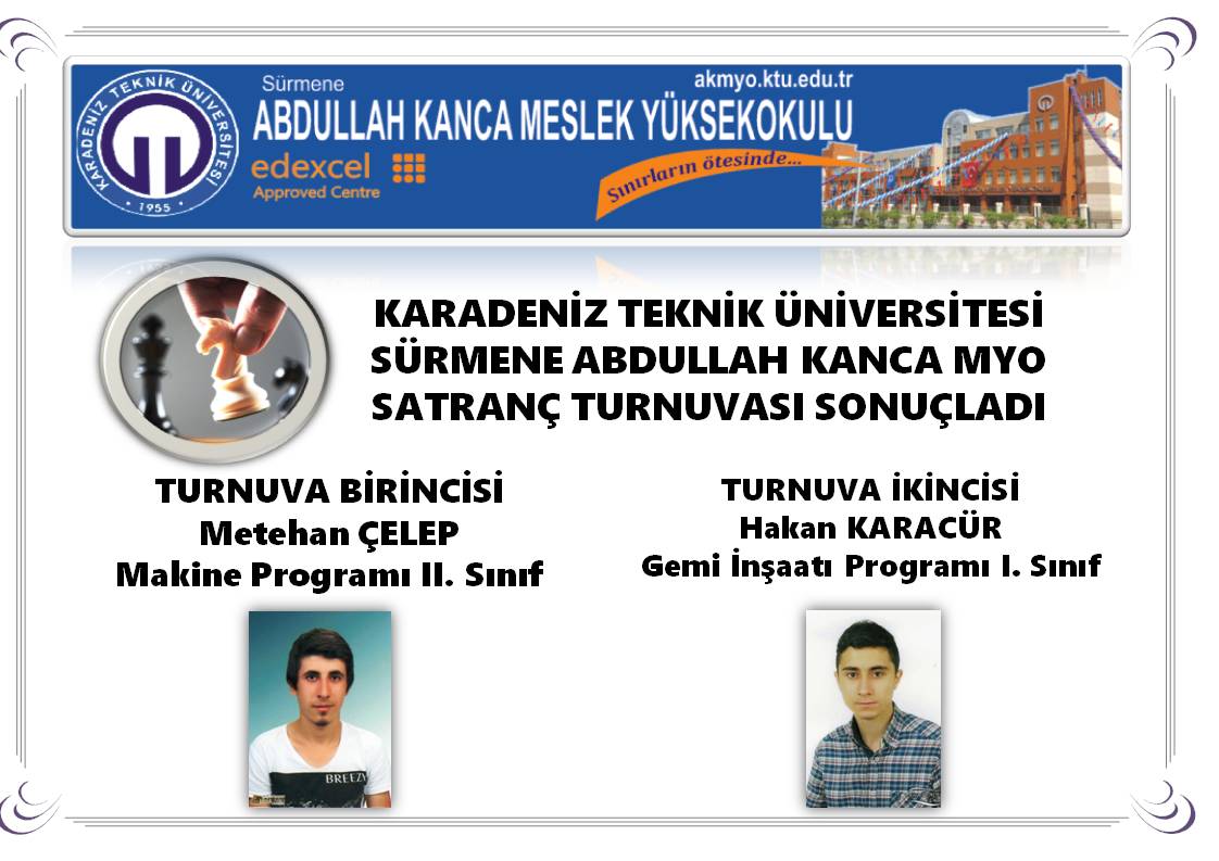 Meslek Yüksek Okulumuz öğrencileri arasında düzenlenen satranç turnuvası sonuçlandı. Turnuvada Birinci ve İkinci olan öğrencilerimizi tebrik ediyoruz. Satranç sorumlusu hocamız Öğr. Gör. Erdinç Şahin'e ve turnuvaya katılan tüm öğrencilerimize teşekkür ediyoruz. MYO Satranç takımımıza KTÜ 35. Spor Şöleni müsabakalarında başarılar diliyoruz.