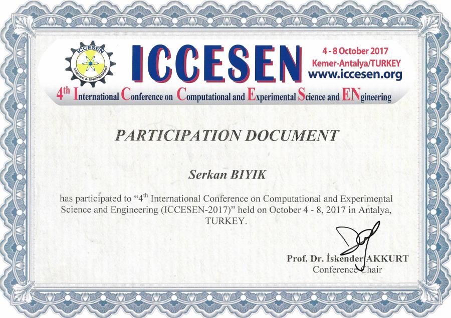 Meslek Yüksekokulumuz Makine ve Metal Teknolojileri Bölüm Başkanı Yrd. Doç. Dr. Serkan BIYIK 4-8 Ekim 2017 tarihleri arasında Antalya'da düzenlenen “4th International Conference on Computational and Experimental Science and Engineering” etkinliğine “Effect of Cubic and Hexagonal Boron Nitride Additions on the Synthesis of Ag-SnO2 Electrical Contact Material” ve “Effect of Reinforcement Ratio on Physical and Mechanical Properties of Cu-W Composites Synthesized by Ball Milling” başlıklı sözlü sunumlar ile katılmıştır.