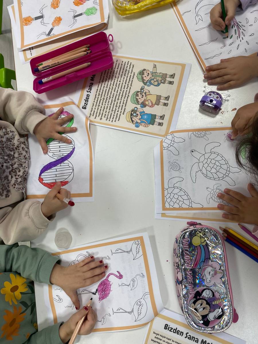 Kaan Dinler Anaokulu’na gerçekleştirilen ziyaret sırasında, e-kitaptan oluşturulan çıktılar çocuklara dağıtılmış; hayvanlar, bitkiler, bakteriler ve diğer biyolojik unsurlara ait görseller eşliğinde öğrencilerle birlikte boyama etkinliği yapılmıştır. Etkinlik süresince çocuklara eğitici ve eğlenceli bir öğrenme ortamı sunulmuştur.
