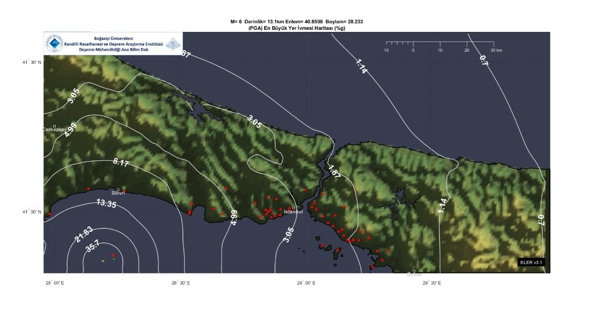 Kandilli Rasathanesi tarafından paylaşılan En Büyük Yer İvmesi (PGA) haritasına göre depremin ivmesi kıyı kesimlerde maksimum 0.1g seviyelerinde olup, uygun mühendislik hizmeti almış yapılarda ağır hasara sebebiyet verecek düzeyde değildir.