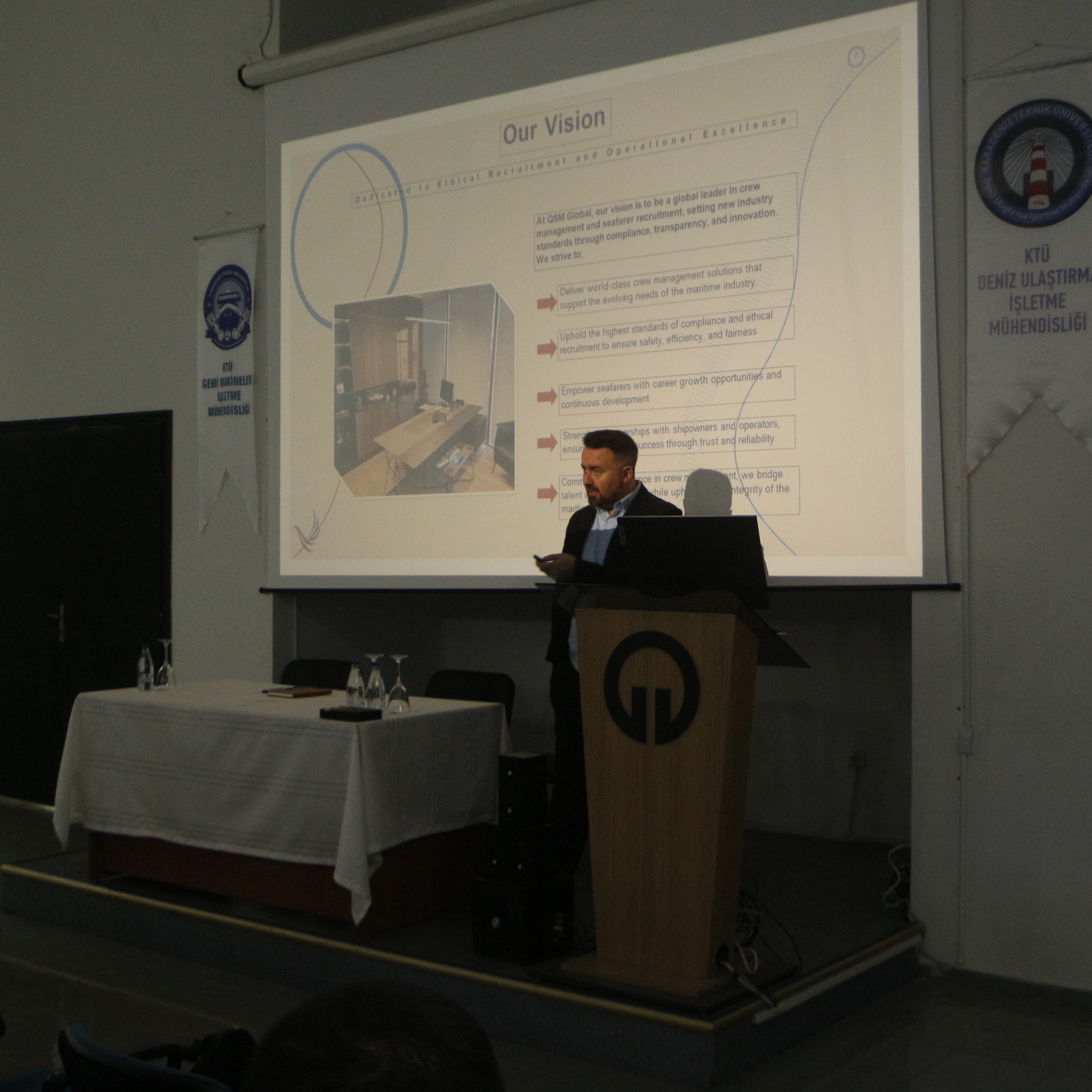 QSM Global kurucu ortaklarından Kaptan Orhan Kasap, denizcilik sektöründe kalite ve emniyet yönetim sistemleri, denetim süreçleri ve bu alandaki kariyer fırsatları hakkında bilgilendirmede bulundu. Program, soru–cevap bölümü ve plaket takdimi ile sona erdi.