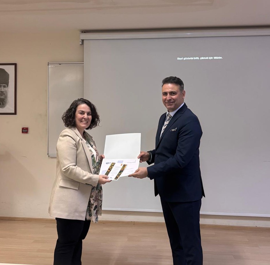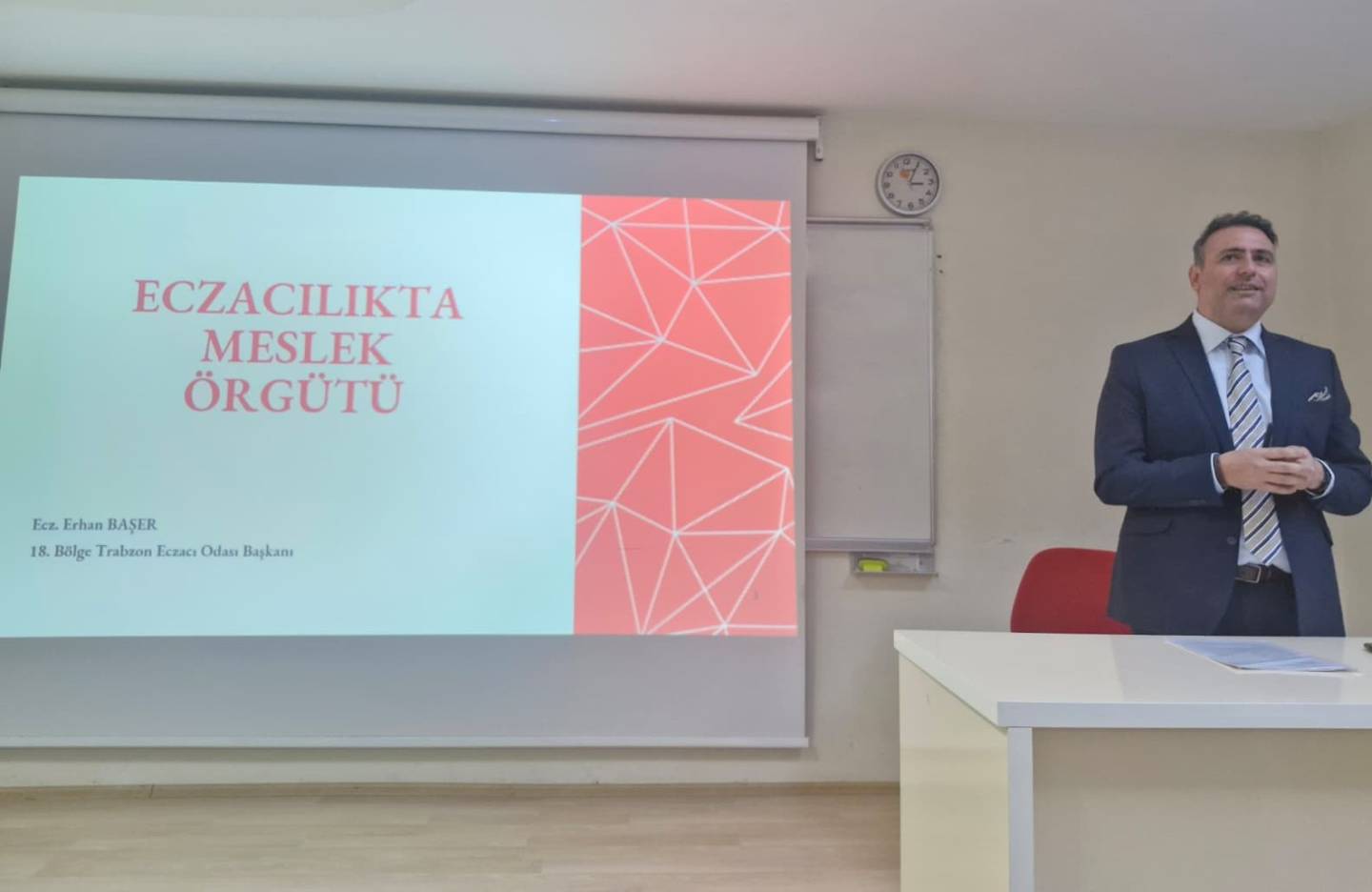 3 Aralık 2025 tarihinde gerçekleştirilen seminerde, 18. Bölge Trabzon Eczacı Odası Başkanı sayın Ecz. Erhan BAŞER; Türk Eczacıları Birliği ve Eczacı Odalarının yapılanmaları, sorumlulukları ve önemleri hakkında değerli bilgiler paylaştı. Seminerin ardından Fakültemiz Dekanı Prof. Dr. Gülin RENDA, sayın Ecz. Erhan BAŞER'e teşekkür belgesi takdim etti.