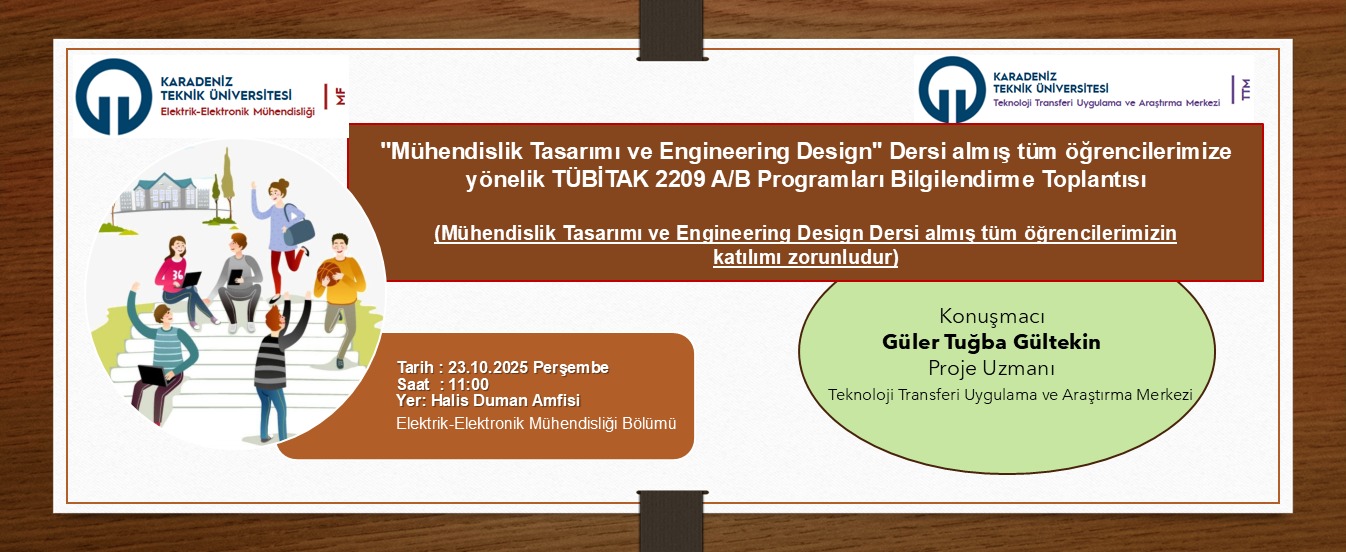 "Mühendislik Tasarımı ve Engineering Design" Dersi almış tüm öğrencilerimize yönelik TÜBİTAK 2209 A/B Programları Bilgilendirme Toplantısı gerçekleştirilecektir.