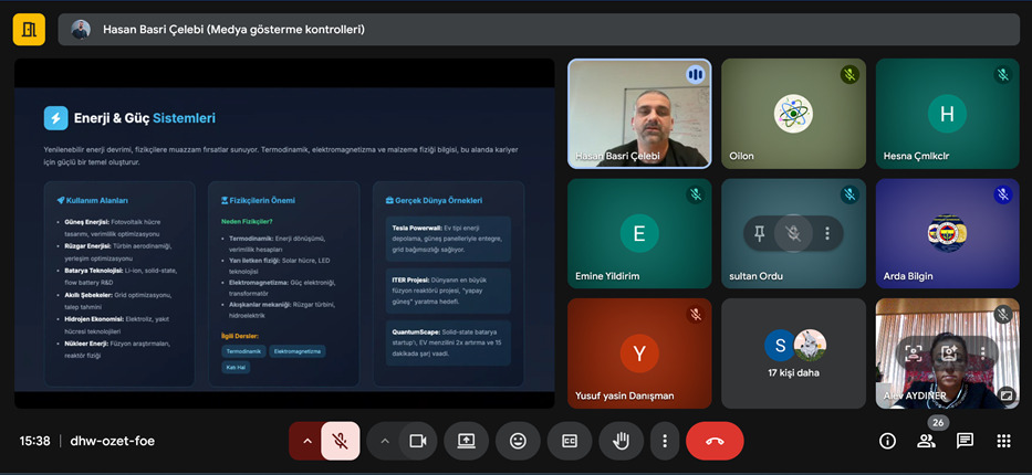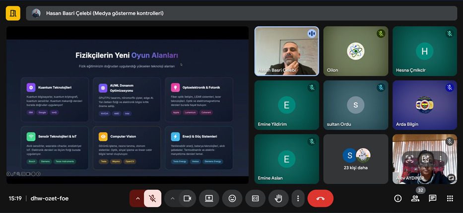 ÇELEBİ, sunumunda fizik eğitiminin yalnızca laboratuvar ya da akademiyle sınırlı olmadığını, yapay zeka, veri bilimi, kuantum bilişim, enerji teknolojileri, yarı iletken endüstrisi, bilgisayarla görü ve Nesnelerin İnterneti gibi IT odaklı alanlarda da fizikçilerin kritik roller üstlenebildiğini vurguladı. Özellikle analitik düşünme, matematiksel modelleme ve karmaşık sistem analizi gibi fizik temelli yetkinliklerin, teknoloji şirketleri tarafından yüksek değer gördüğünün altını çizdi.