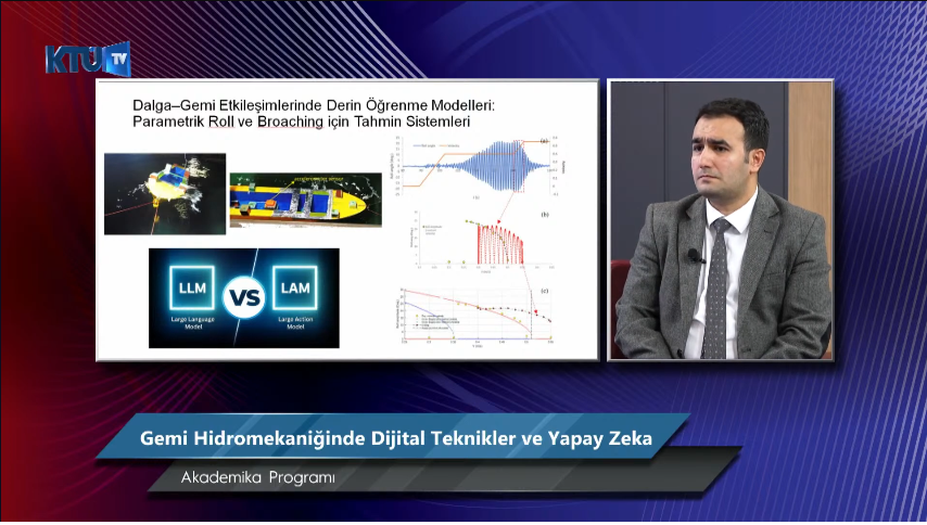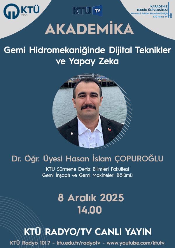 Bölüm öğretim üyemiz ve Dış İlişkiler Genel Koordinatörlüğü Koordinatör Yardımcısı Dr. Öğr. Üyesi Hasan İslam ÇOPUROĞLU 8 Aralık 2025 tarihinde saat 14.00'te KTÜ RADYO/TV'nin canlı yayın konuğu olmuş ve "Gemi Hidromekaniğinde Dijital Teknikler ve Yapay Zeka" konulu program yapılmıştır.