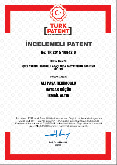 Bölümümüz öğretim üyelerinden Dr. Öğr. Üyesi İsmail Altın'ın, Recep Tayyip Erdoğan Üniversitesi'nden Prof. Dr. Haydar Küçük ve Dr. Öğr. Üyesi Ali Paşa Hekimoğlu ile birlikte hazırlamış oldukları "İçten Yanmalı Motorlu Araçlarda Radyatörsüz Soğutma Sistemi" başlıklı patent başvurusu Türk Patent ve Marka Kurumu tarafından tescil edilmiştir.