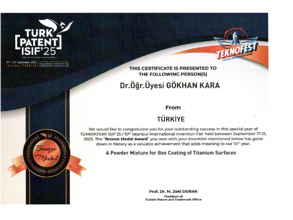 Dr. Öğr. Üyesi Gökhan KARA, 17-21 Eylül 2025 tarihlerinde düzenlenen "TÜRKPATENT ISIF'25 - 10. İstanbul Uluslararası Buluş Fuarı"nda Bronz Madalya ile ödüllendirilmiştir.