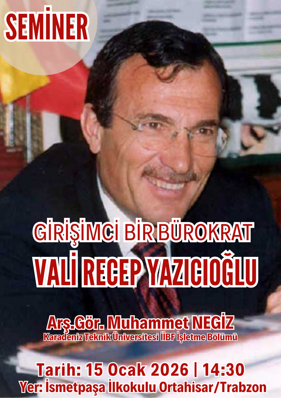 Karadeniz Teknik Üniversitesi İİBF İşletme Bölümü Yönetim ve Organizasyon Anabilim Dalı Araştırma Görevlisi Muhammet Negiz tarafından Ortahisar İsmetpaşa İlkokulu öğretmenlerine "Girişimci Bir Bürokrat: Vali Recep Yazıcıoğlu" başlıklı dönem sonu semineri verildi. Merhum Recep Yazıcıoğlu’nun Tokat, Aydın, Erzincan, Merkez ve Denizli illerini kapsayan valilik dönemi olan 1985-2003 yıllarındaki faaliyetlerinin ele alındığı seminerde bir girişimci bürokratın hayatından alınabilecek dersler değerlendirildi. Araştırma Görevlisi Negiz’in merhum Vali’ye dair arşiv incelemeleri ve mülakatlar neticesinde ulaştığı bilgi ve belgeler öğretmenlere sunuldu.