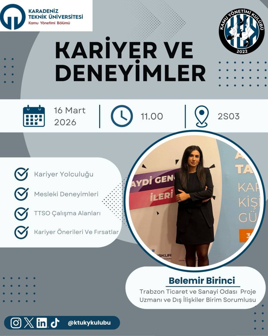 KAM 4010 Siyaset Sosyolojisi dersi kapsamında gerçekleştirilecek deneyim paylaşımı etkinliğinde, Trabzon Ticaret ve Sanayi Odası Proje Uzmanı ve Dış İlişkiler Birim Sorumlusu Belemir Birinci konuk konuşmacı olarak yer alacaktır.