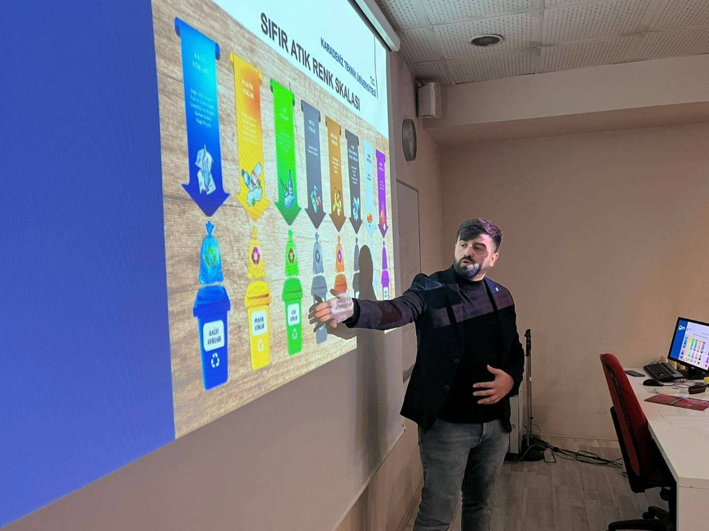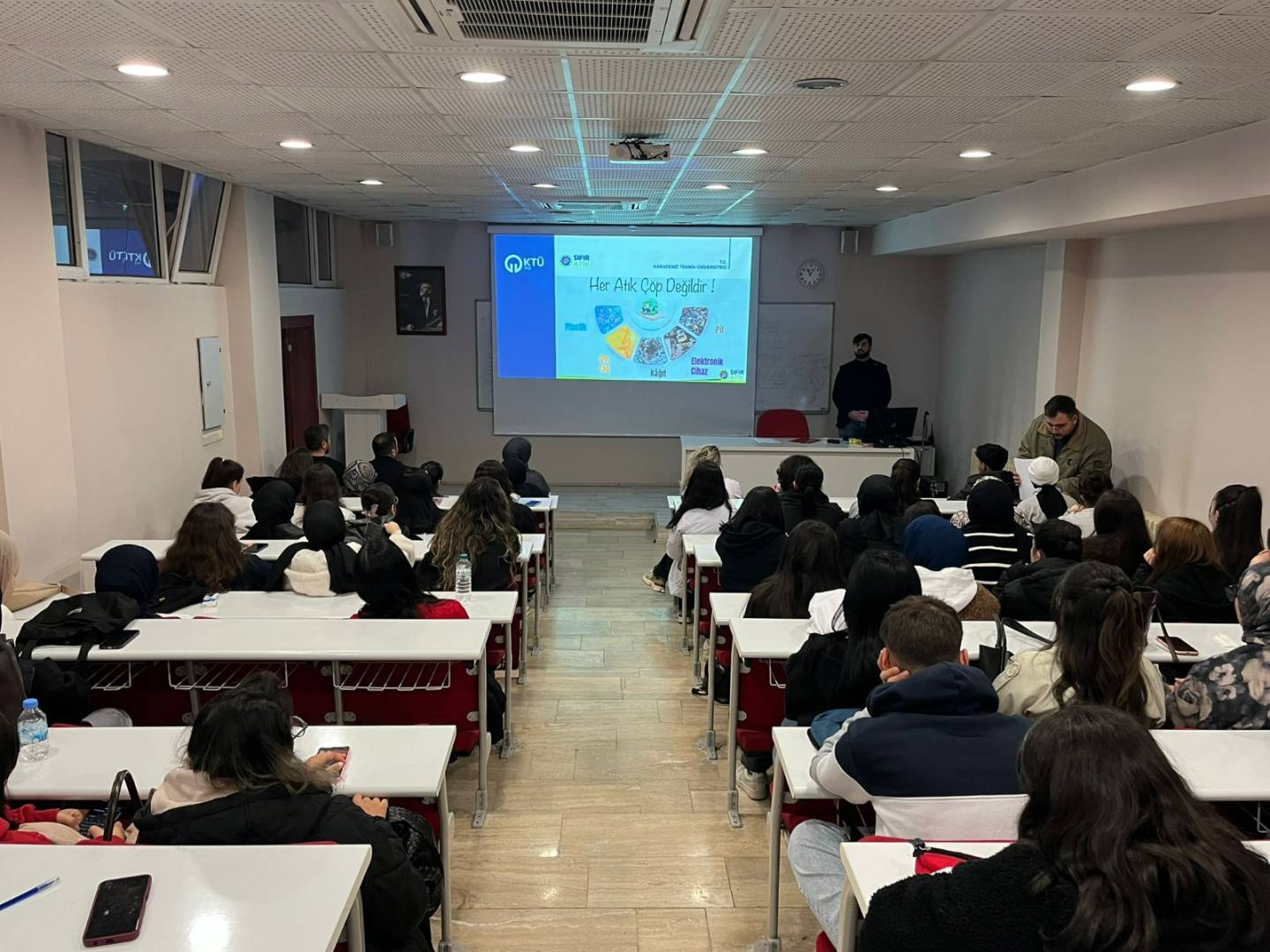 Karadeniz Teknik Üniversitesi Sıfır Atık Koordinatörlüğü tarafından, 02 Aralık 2025 tarihinde Meslek Yüksekokulumuz öğrencilerine yönelik olarak Sıfır Atık Eğitimi düzenlenmiştir. Çevre Mühendisi Hasan ATEŞ tarafından verilen eğitim kapsamında, Atıkların kaynağında ayrıştırılması, Doğal kaynakların verimli kullanımı, Geri dönüşüm ve yeniden kullanım uygulamaları hakkında kapsamlı bilgiler aktarılmıştır.