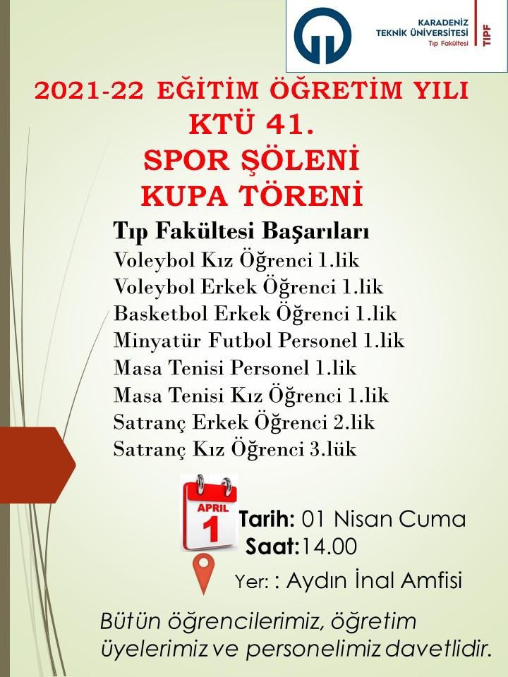 2021-2022 eğitim öğretim yılı KTÜ 41. Spor Şöleni ve Kupa Törenine tüm öğrencilerimiz, öğretim üyelerimiz ve personelimiz davetlidir.