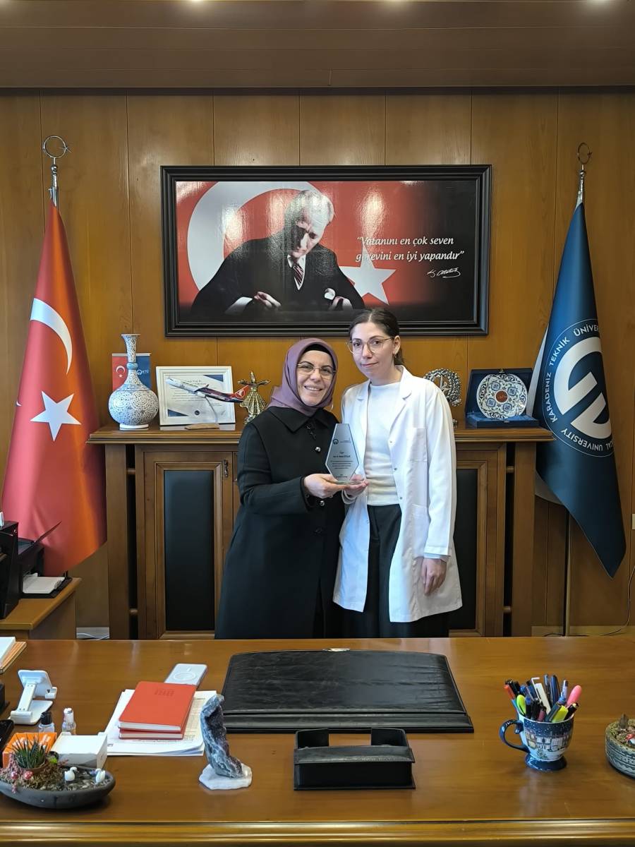 Fakültemizde uzmanlık eğitimlerini tamamlayan Aile Hekimliği Anabilim Dalından Uzm. Dr. Merve DİLEKCİ, Nöroloji Anabilim Dalından Uzm. Dr. Hande USTALAR, Anesteziyoloji ve Reanimasyon Anabilim Dalından Uzm. Dr. Eren Hakkı İŞCİ ve İç Hastalıkları Anabilim Dalından Hematoloji Yan Dal Uzm. Dr. Turhan KÖKSAL'a Dekanımız Prof. Dr. Sevdegül AYDIN MUNGAN tarafından plaketleri takdim edildi.
