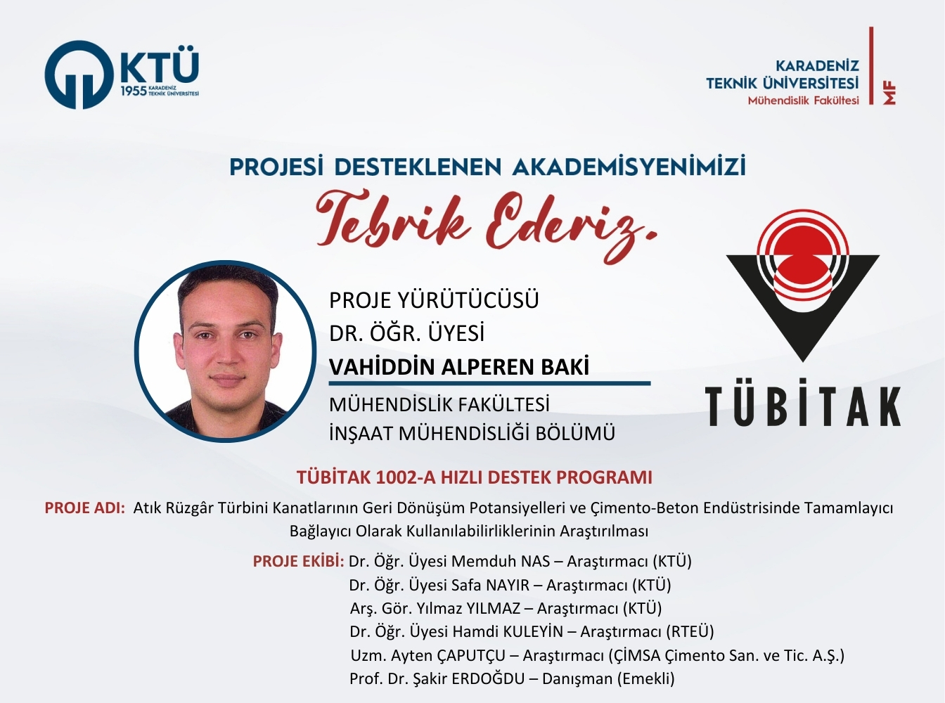 Fakültemiz İnşaat Mühendisliği Bölümü öğretim üyelerinden Dr. Öğr. Üyesi Vahiddin Alperen BAKİ'nin “Atık Rüzgâr Türbini Kanatlarının Geri Dönüşüm Potansiyelleri ve Çimento-Beton Endüstrisinde Tamamlayıcı Bağlayıcı Olarak Kullanılabilirliklerinin Araştırılması” başlıklı projesi, “TÜBİTAK 1002-A Hızlı Destek Modülü” kapsamında desteklenmiştir.