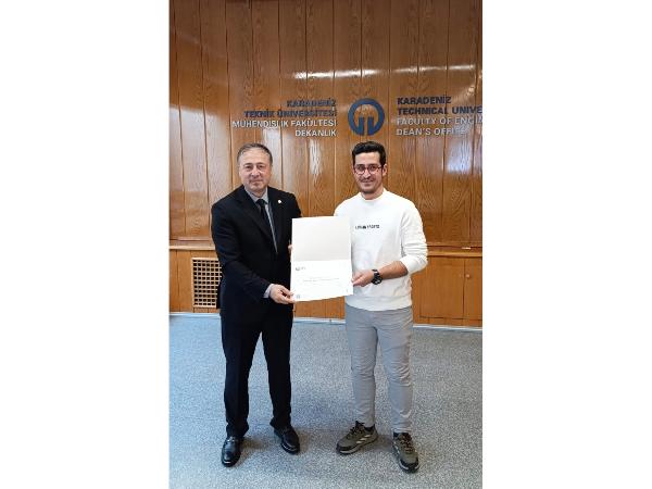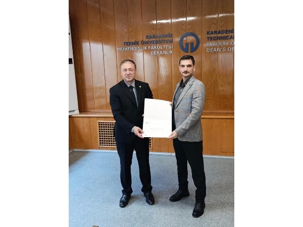 Arş. Gör. Serhatcan Berk AKÇAY'a tescil edilen patenti dolayısıyla teşekkür belgesi takdim edildi.