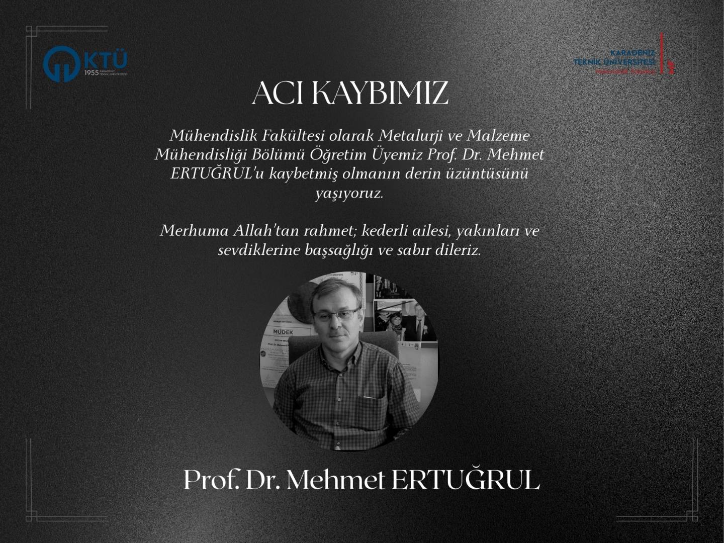 Mühendislik Fakültesi olarak Metalurji ve Malzeme Mühendisliği Bölümü Öğretim Üyemiz Prof. Dr. Mehmet ERTUĞRUL’u kaybetmiş olmanın derin üzüntüsünü yaşıyoruz.