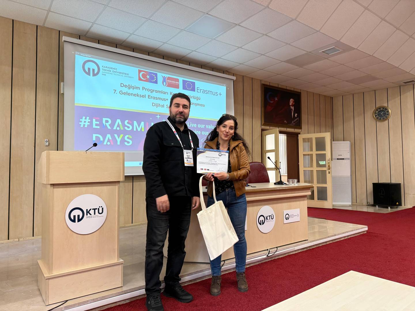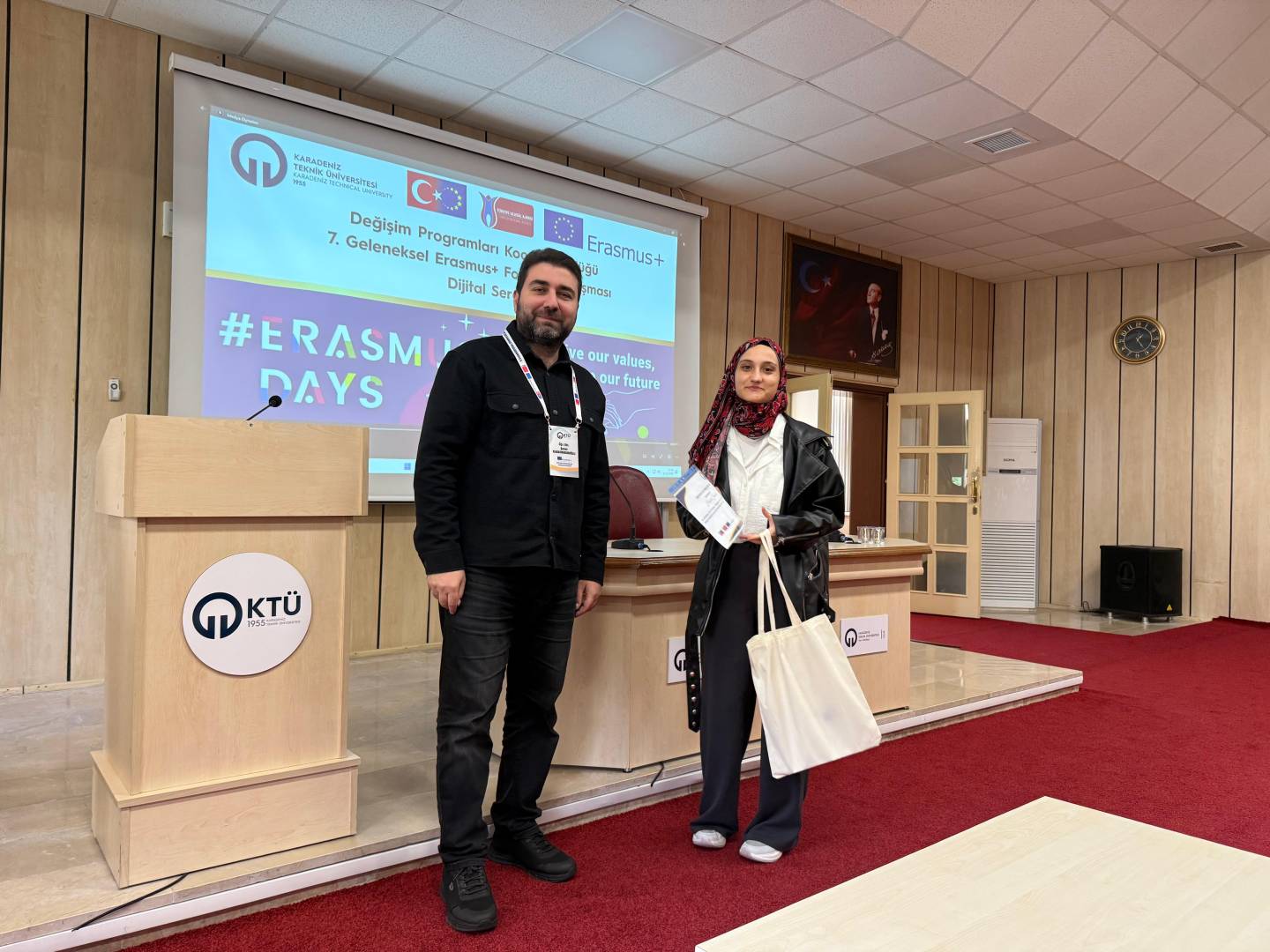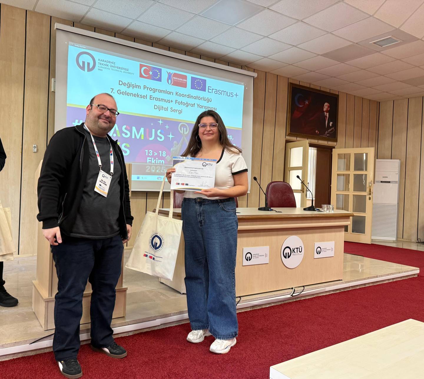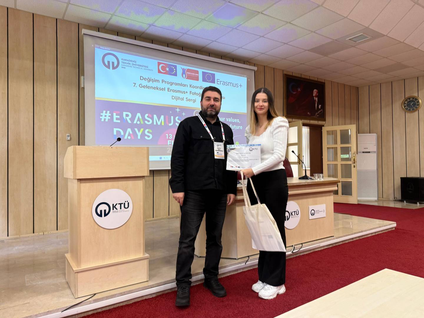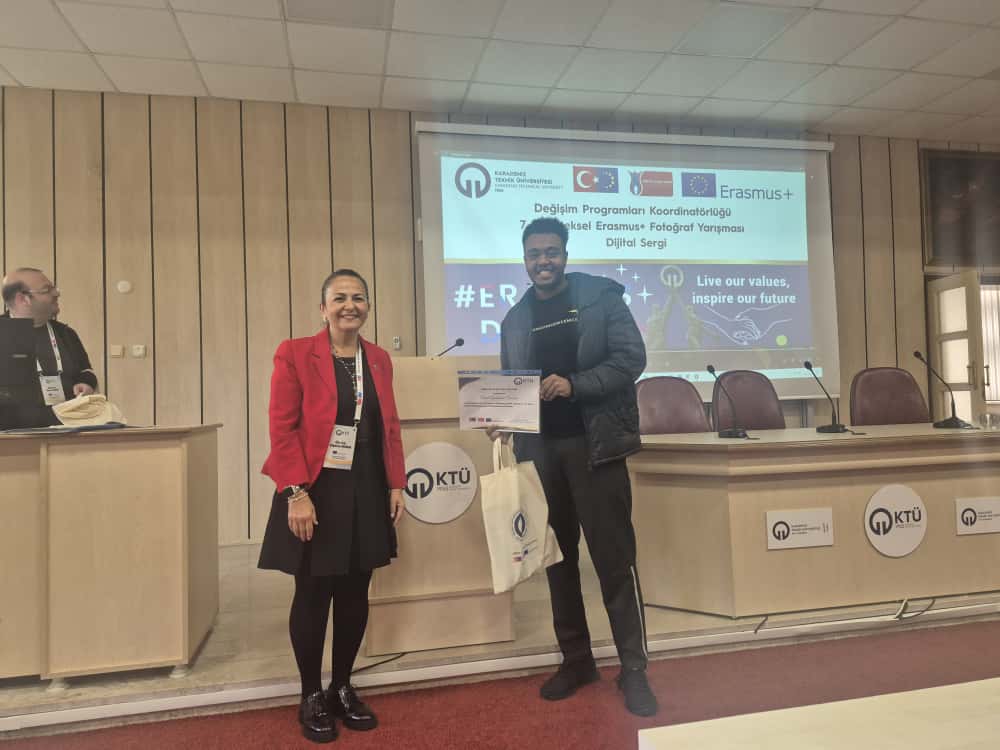 Bu yıl da hem dünyanın farklı ülkelerindeki hem de ülkemizdeki diğer üniversiteler ile eş zamanlı olarak, Üniversitemiz Değişim Programları Koordinatörlüğü’nün organizasyonuyla KTÜ Erasmus Günleri 2025 etkinlikleri 13-14-15 Ekim 2025 tarihlerinde düzenlendi. Etkinlikler kapsamında ayrıca 7. Geleneksel Erasmus+ Fotoğraf Yarışması düzenlendi. Yarışmada daha önce Erasmus+ programından faydalanmış öğrencilerin fotoğrafları yarıştı. Etkinliğin birinci gününde yarışmaya katılım sağlayan öğrencilerin fotoğrafları dijital sergi olarak Koordinatörlüğümüzün sosyal medya hesaplarında paylaşıldı. Etkinliğin ikinci gününde oylama sonucu ilk üçe giren fotoğrafların sahibi öğrencilerimiz için Fen Fakültesi Nazım Terzioğlu Amfisi'nde ödül töreni düzenlendi. Dereceye giren öğrencilerimize hediyeleri Dış İlişkiler Genel Koordinatörü Prof. Dr. Sercan EROL ve Değişim Programları Koordinatörlüğü ekibi tarafından takdim edildi. Ödül töreninin ardından Değişim Programları Koordinatörlüğü tarafından Erasmus+ Öğrenci Öğrenim ve Staj Hareketliliği programları hakkında bilgilendirme toplantısı düzenlendi. Etkinliğin son gününde daha önce Erasmus+ programından faydalanmış öğrencilerimiz deneyimlerini anlatan sunumlar gerçekleştirdiler ve Erasmus Student Network'ün KTÜ'deki temsilcisi olan ESN Trabzon tarafından ESN öğrenci topluluğunu tanıtan bir sunum gerçekleştirildi. Etkinliklere ve fotoğraf yarışmasına katılan tüm öğrencilerimize teşekkür ederiz.