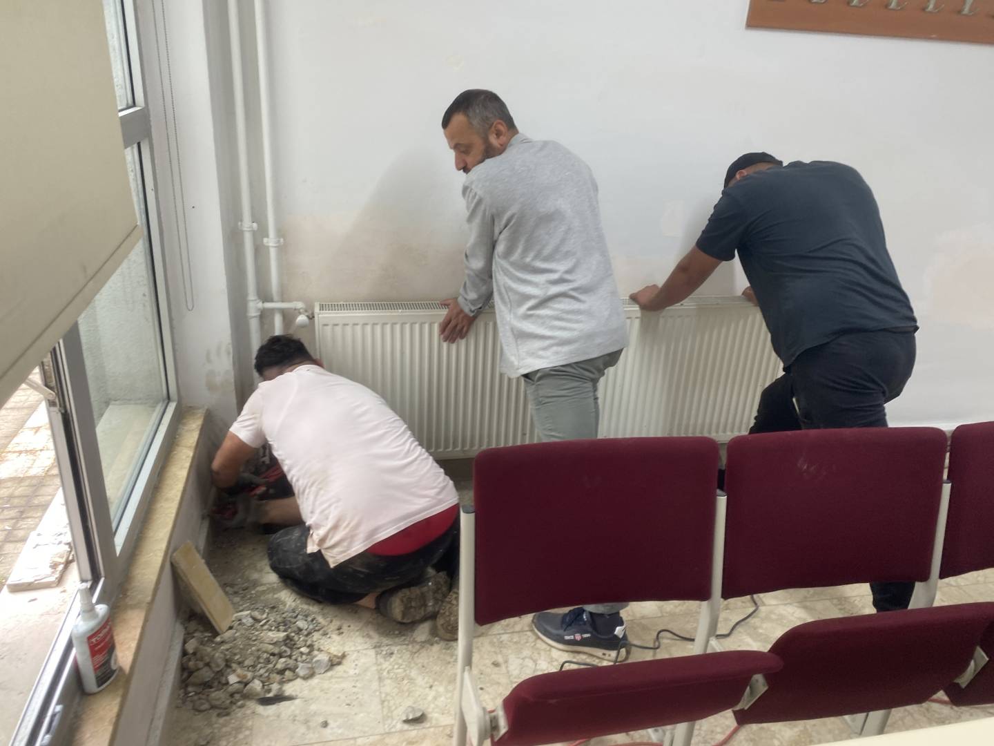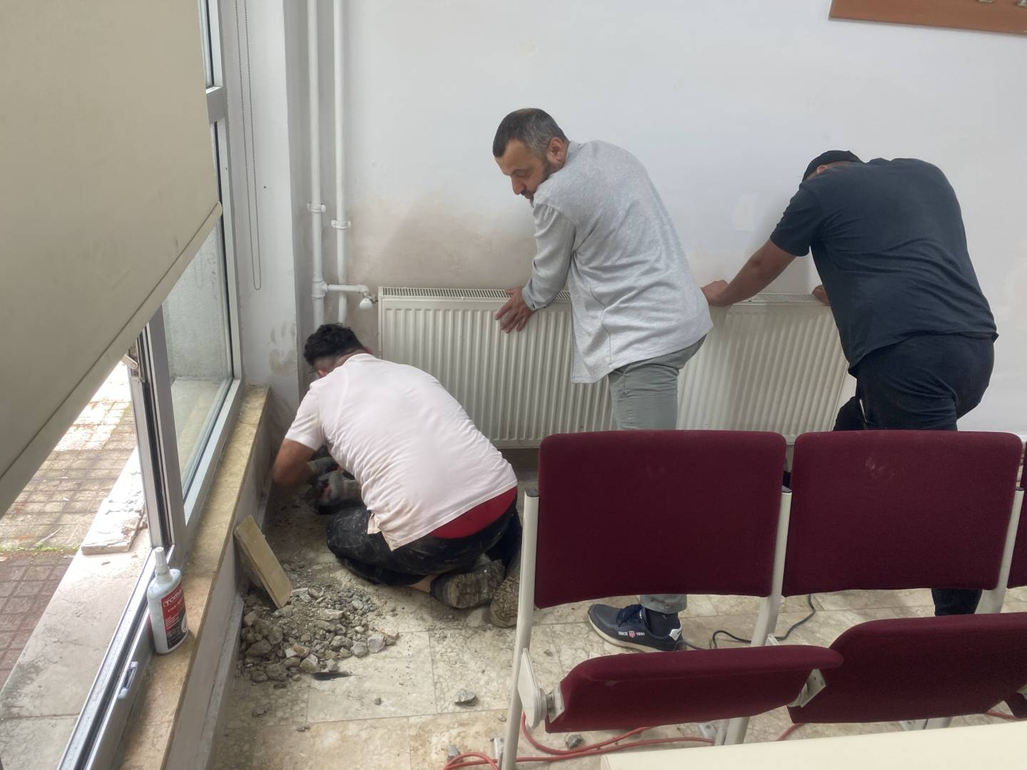 Fakültemiz İnşaat Mühendisliği bölümü derslik-2 de arızalı olan ve sürekli su sızıntısı yaparak duvarlara küf oluşturan peteklerin demir boruları plastik borularla değiştirilerek sorun çözüldü. Hem kalorifer tesisatındaki su azalması giderildi hem ısı kaybı önlendi hem de sınıftaki görüntü kirliliği düzeltildi.