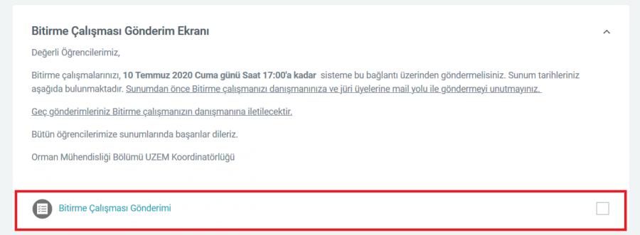 Bitirme Çalışmasının son hali, 10 Temmuz 2020 Saat 17:00'ye tarihine kadar UZEM sistemine yüklenmelidir. Gönderim için, UZEM sistemi üzerinden “Bitirme Çalışması” isimli derse girilmelidir. Ardından;