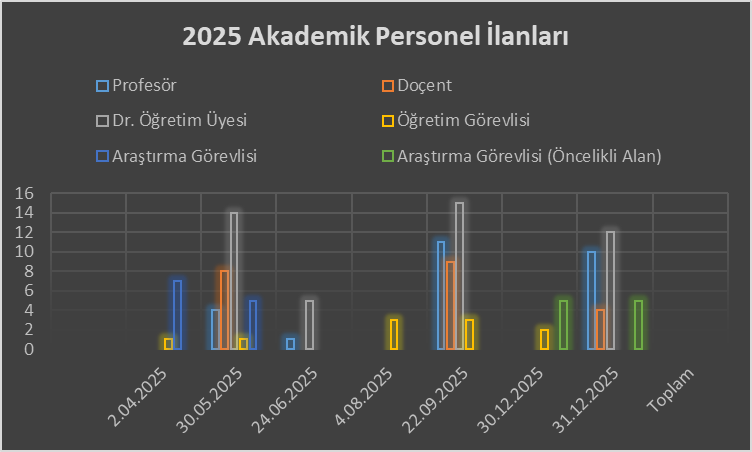 | İlan Tarihi | Profesör | Doçent | Dr. Öğretim Üyesi | Öğretim Görevlisi | Araştırma Görevlisi | Araştırma Görevlisi (Öncelikli Alan) |