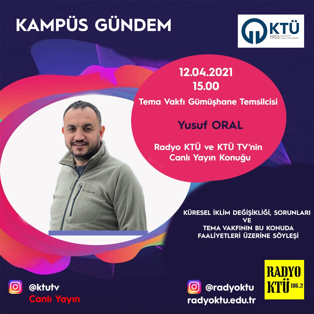 | 13.04.2021 - KÜRSEL İKLİM DEĞİŞİKLİĞİ ÜZERİNE SÖYLEŞİ- TEMA VAKFI TEMSİLCİSİ YUSUF ORAL KONUK | 14.04.2021- SANATA BAKIŞ- HALK MÜZİĞİ ÜZERİNE SÖYLEŞİ VE MÜZİK DİNLETİSİ- DOÇ.AYŞEGÜL ERGENE | 15.03.2021 BAŞARILARININ MİMAMARLARI İLE ARANIZDAKİ KÖPRÜ KTÜ KARİYER MERKEZİ | ||