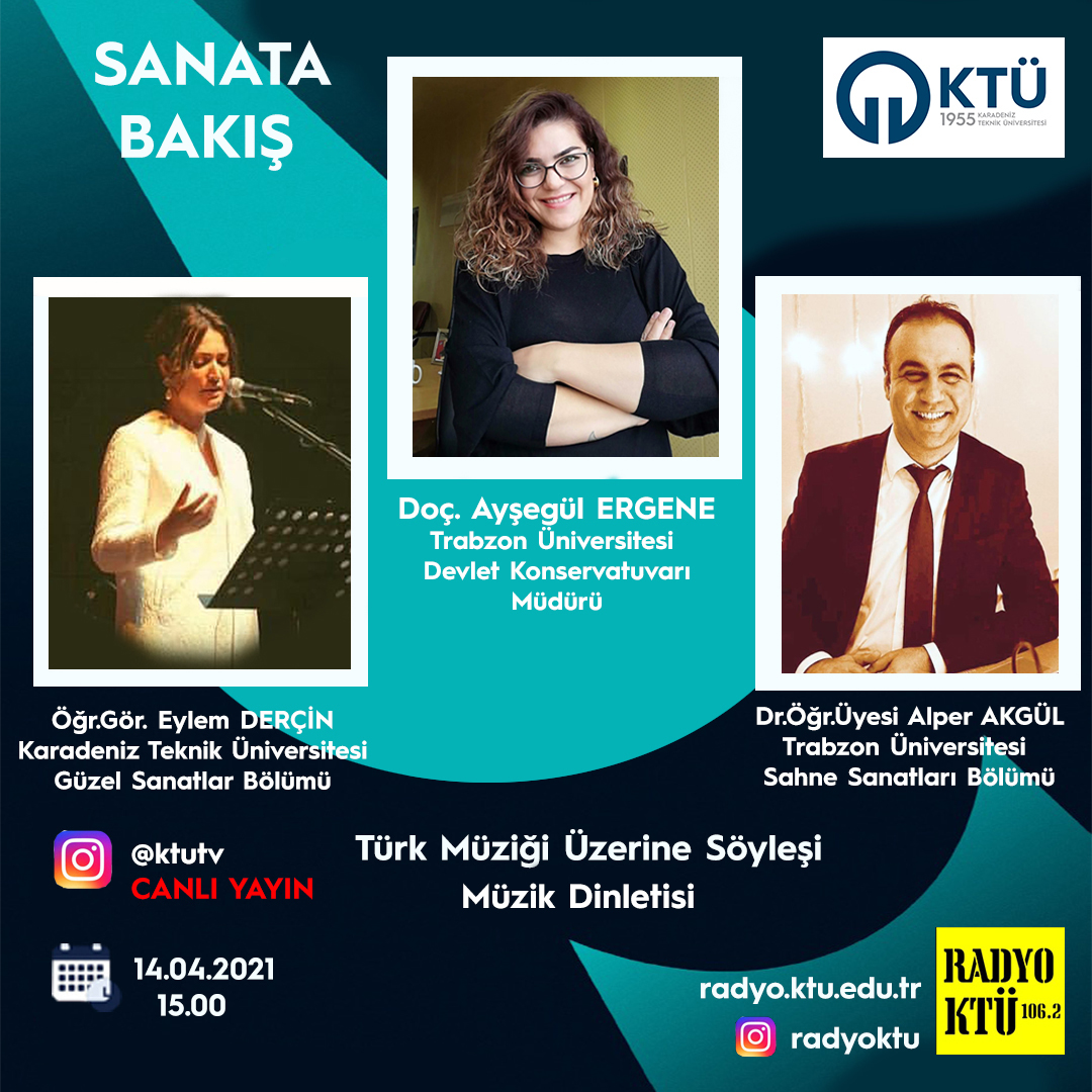 | 27.05.2021 - KTÜ'DEN SAĞLIK- COVİD 19 VE AŞILAMA- PROF.DR.TEVFİK ÖZLÜ KONUK | 28.04.2021 SANATA BAKIŞ - KONUK AYŞEGÜL ERGENE- TİYATRO ÜZERİNE SÖYLEŞİ | 28.04.2021 TEMEL BAYRAM MUSA GÖMLEKSİZ MÜZİK DİNLETİS | ||