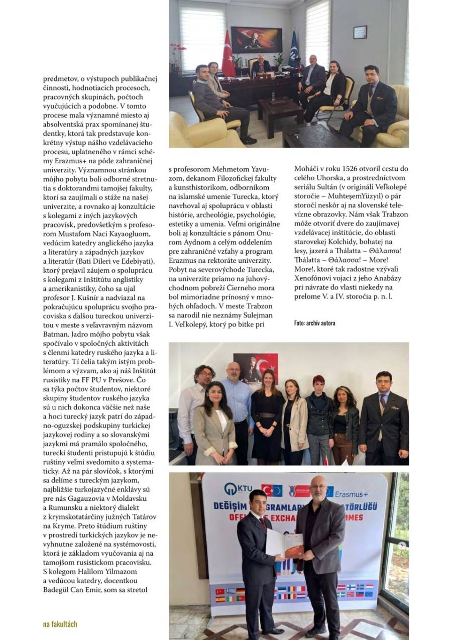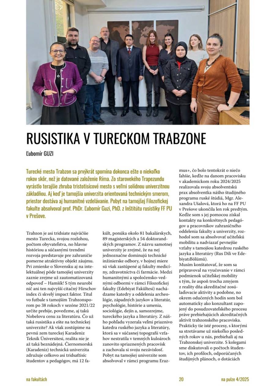 Slovakya’nın köklü eğitim kurumlarından Preşov Üniversitesi tarafından yayımlanan Na Pulze dergisinin 4 Aralık 2025 tarihli sayısında Preşov Üniversitesi Rus Filolojisi Bölümü Öğretim Üyesi Prof. Dr. Lyubomir GUZİ, Erasmus+ kapsamında Bölümümüze gerçekleştirilen seyahati hakkındaki deneyimlerini paylaştı.