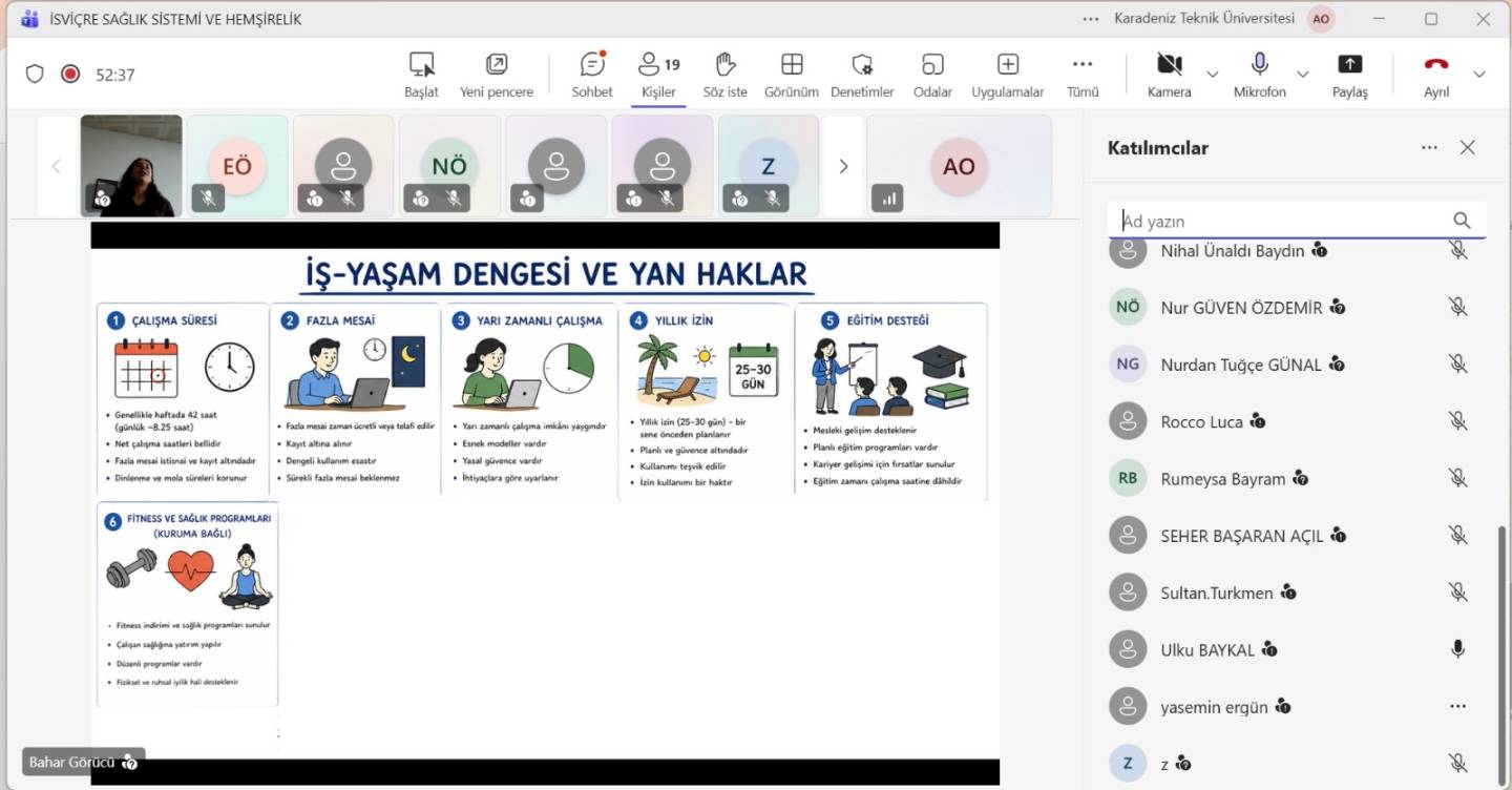 2026 Kalite Güvence Sistemi Faaliyetlerimizde yer alan ''Uluslararasılaşmayı Teşvik Etkinliklerimiz'' kapsamında Zürih Uygulamalı Bilimler Üniversitesi Hemşirelik Enstitüsünden misafir Yüksek Lisans öğrencisi olarak gelen Bahar Yasemin Görücü tarafından ''İsviçre Sağlık Sistemi & Hemşirelik adlı seminer gerçekleştirildi.