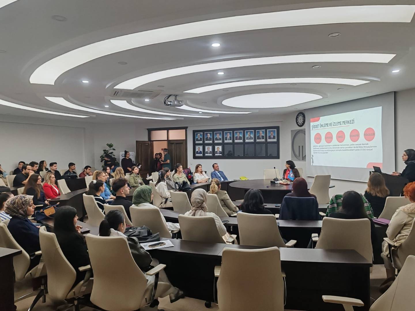 İktisadi ve İdari Bilimler Fakültesi Toplantı Salonu’nunda düzenlenen Panelde Prof. Dr.Mevhibe COŞAR’ın yönlendiriciliğinde Giresun Üniversitesinden Araş. Gör. Dr. Sinem ÇAPAR İLERİ “Dile Gelen Şiddet”, Aile ve Sosyal Hizmetler İl Müdürlüğünden Hümeyra SARAL FAZLIOĞLU “Şiddet Önleme ve İzleme Merkezi İşleyişi” ve Giresun Barosu avukatlarından Sevda Yağmur ÇETİN de “6284 Sayılı Kanun: Şiddetle Mücadelede Hukuki Bir Adım” konulu sunumlarını yapmışlardır.
