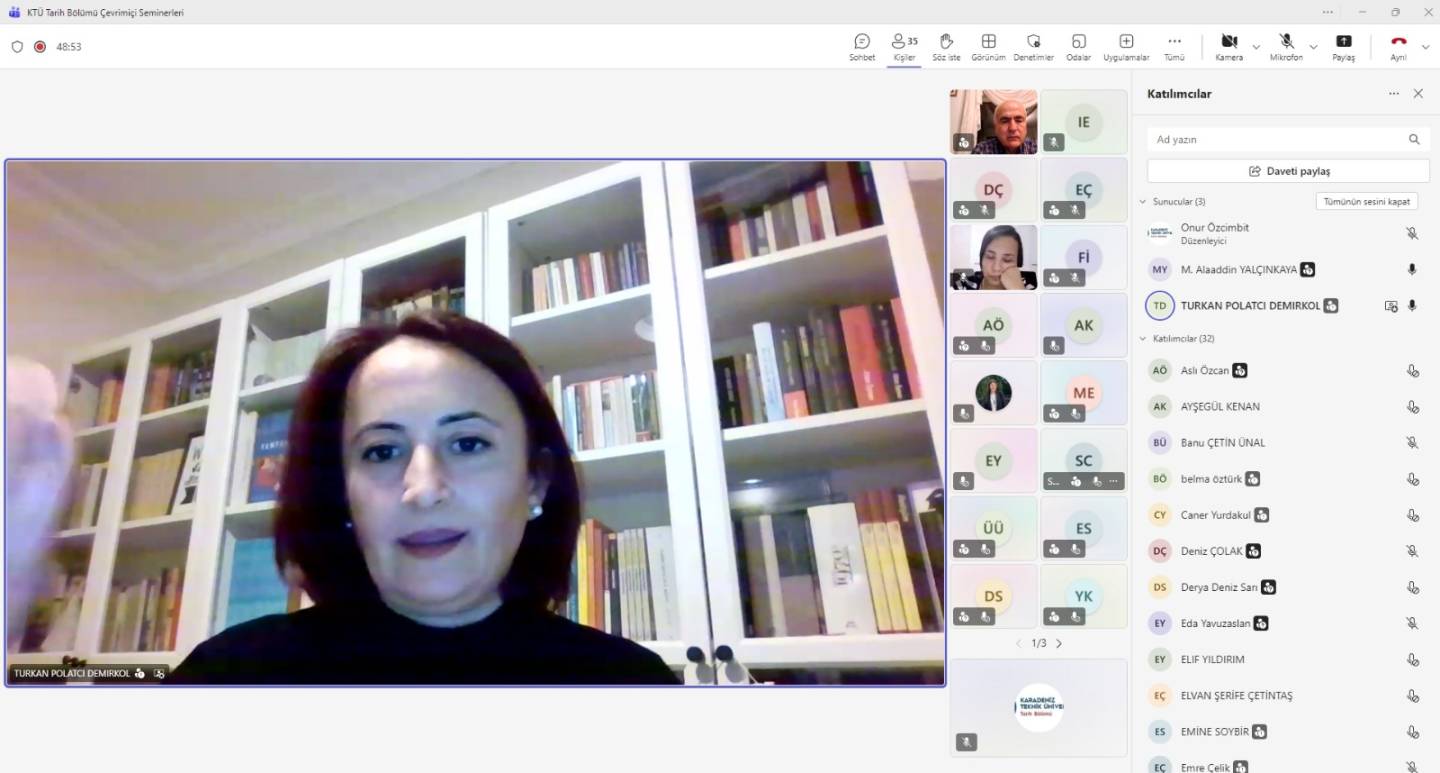 10.12.2025 tarihinde saat 20:00'da Çankırı Karatekin Üniversitesi hocalarından Prof. Dr. Türkan Polatçı Demirkol'un sunumu ile Osmanlı Diplomasisinde Teşrifat Kurumu ve Dönüşümü adlı çevrimiçi seminer KTÜ tarih bölümü hocaları ve öğrencilerinin de katılımı ile gerçekleştirilmiştir.