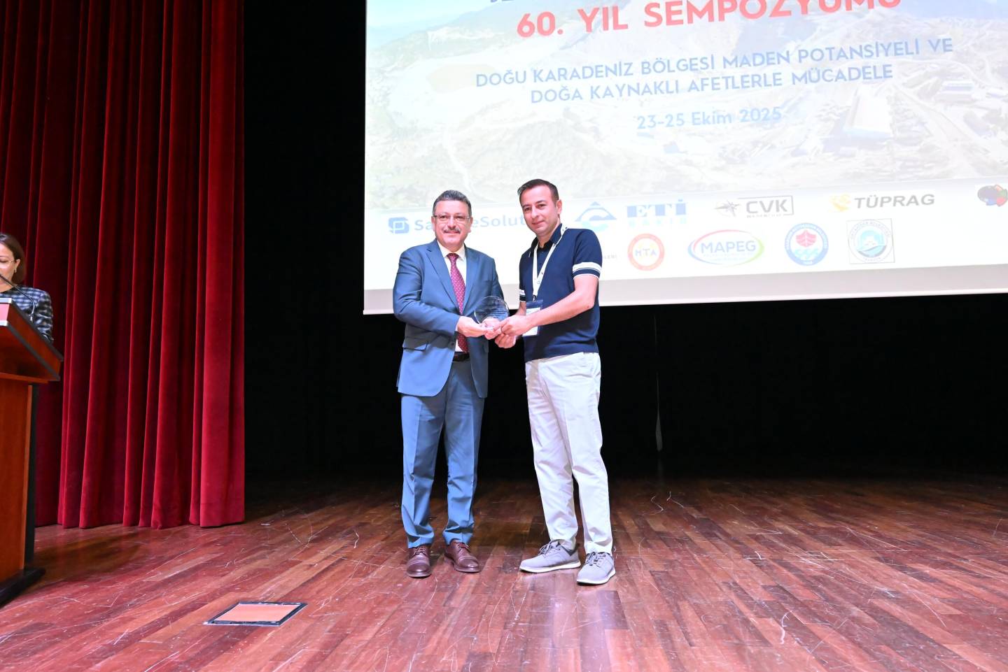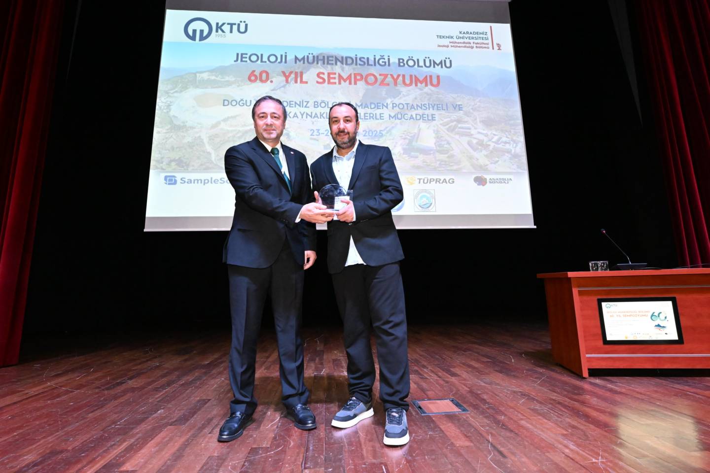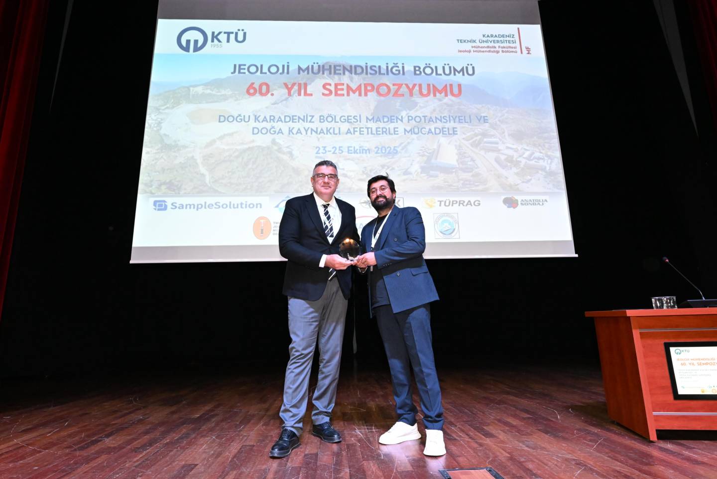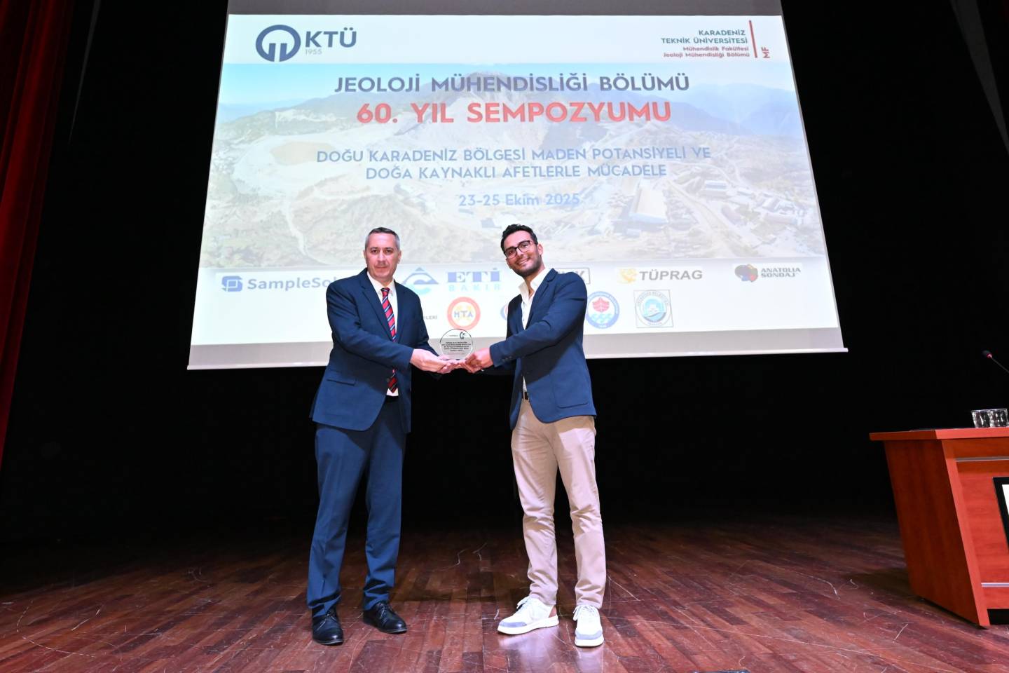 Jeoloji Mühendisliği 60. Yıl Sempozyumu açılış programının son kısmında, sempozyumun düzenlenmesinde destek olan kurum temsilcilerine protokol üyeleri tarafından plaketleri takdim edildi.