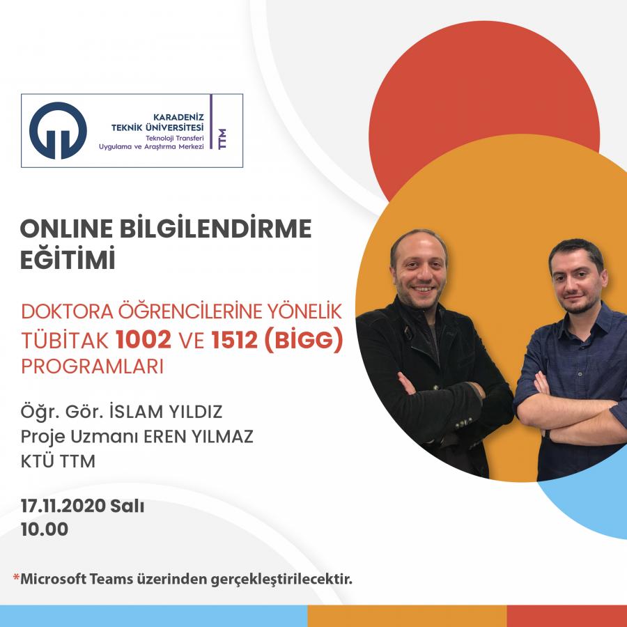 KTÜ TTM tarafından doktora öğrencilerine yönelik "TÜBİTAK 1002 Hızlı Destek ve 1512 Bireysel Genç Girişim Programları" kapsamında online bilgilendirme etkinliği düzenlenecektir.