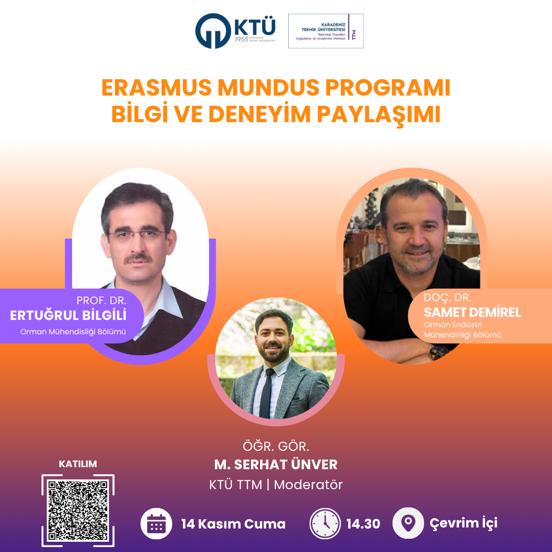 Prof. Dr. Ertuğrul BİLGİLİ, KTÜ Orman Fakültesi Orman Mühendisliği Bölümü öğretim üyesi olup Erasmus Mundus programı kapsamında desteklenen “Mediterranean Forestry and Natural Resources Management (MEDFOR)” başlıklı projeyi yürütmüştür. Doç. Dr. Samet DEMİREL, KTÜ Orman Fakültesi Orman Endüstri Mühendisliği Bölümü öğretim üyesi olup Erasmus Mundus programı kapsamında desteklenen “Development of Wood Science Master Programme (Wood-Mas)” başlıklı projeyi yürütmektedir.
