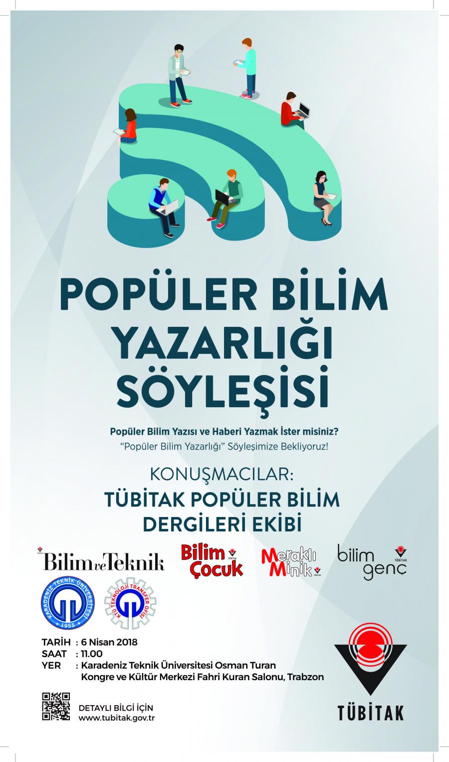 TÜBİTAK Popüler Bilim Dergileri Müdürlüğü tarafından, Karadeniz Teknik Üniversitesi (KTÜ) ve Karadeniz Teknik Üniversitesi Teknoloji Transfer Ofisi (KTÜ TTO) işbirliğinde 6 Nisan Cuma günü saat 11.00’de KTÜ Osman Turan Kongre ve Kültür Merkezi’ndeKTÜ akademisyenleri, lisans, yüksek lisans ve doktora öğrencileri için"Popüler Bilim Yazarlığı Söyleşisi" düzenlenecektir.