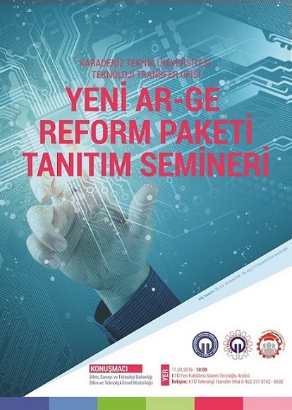 Bilim ve Teknoloji Genel Müdürlüğü, Kamu- Üniversite Sanayi İşbirliği (KÜSİ) ve Karadeniz Teknik Üniversitesi Teknoloji Transfer Ofisi işbirliğiyle ' Yeni Ar-Ge Reform Paketi Tanıtım Semineri'11 Mart 2016 Cuma günü saat 10:00'da üniversitemiz bünyesindeki KTÜ Fen Fakültesi Nazım Terzioğlu Amfisi'nde düzenlenecektir. Seminer Bilim ve Teknoloji Genel Müdürlüğü tarafından verilecektir. Tüm öğretim elemanlarımız davetlidir.