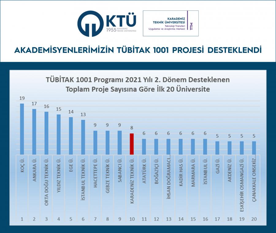 Böylece 2021 yılı 2. döneminde TÜBİTAK 1001 Programı’na KTÜ’den sunulan 37 projenin toplamda 8’i desteklenerek projeleri desteklenen kurumlar arasında 10. sırada yer almıştır.