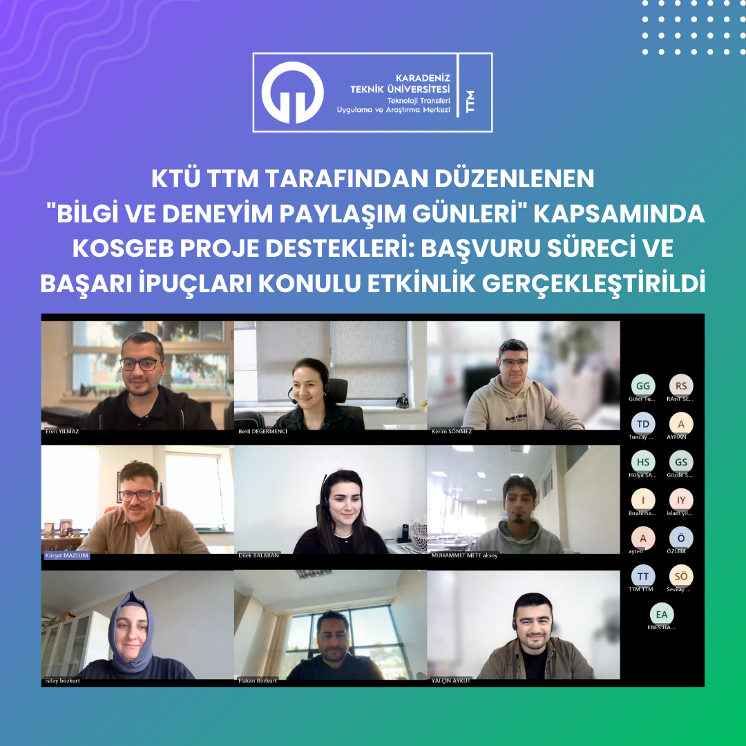 Karadeniz Teknik Üniversitesi Teknoloji Transferi Uygulama ve Araştırma Merkezi (KTÜ TTM) tarafından herhafta düzenlenen Bilgi ve Deneyim Paylaşım Günleri etkinlik serisi kapsamında bu hafta "KOSGEB Proje Destekleri: Başvuru Süreci ve Başarı İpuçları" etkinliği geçekleştirildi.