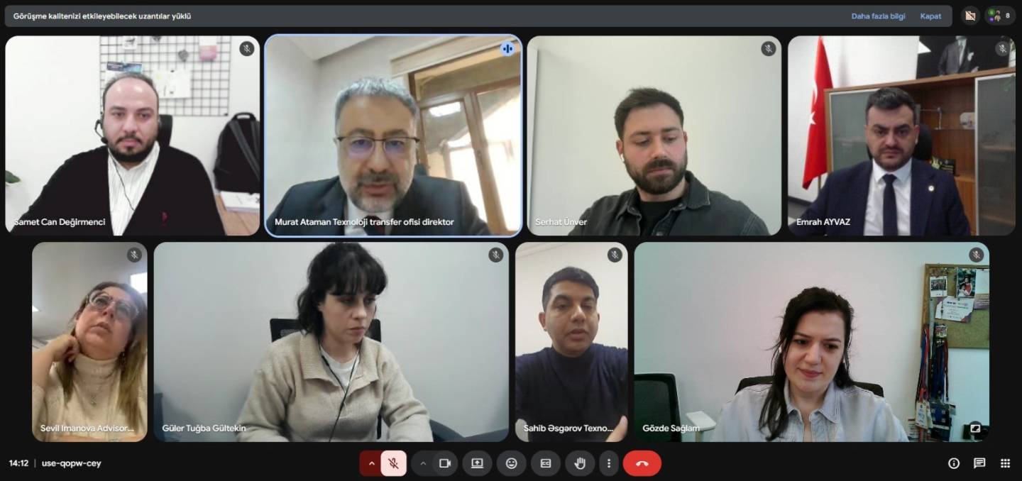 Merkezimiz Müdürü Öğr. Gör. Emrah AYVAZ ve Merkezimiz personellerinin katılım sağladığı toplantıda, Azerbaycan Teknik Üniversitesi Rektör Danışmanı Sevil IMANOVA ile üniversitenin Teknoloji Transfer Ofisi Direktörü Mehmet Murat ATAMAN ve ilgili birim personeli yer alırken; mevcut çalışmalar, teknoloji transferi uygulamaları ve potansiyel uluslararası proje iş birlikleri ele alındı.