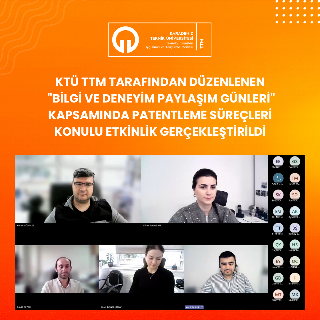 Karadeniz Teknik Üniversitesi Teknoloji Transferi Uygulama ve Araştırma Merkezi (KTÜ TTM) tarafından düzenlenen “Patentleme Süreçleri Bilgi ve Deneyim Paylaşımı” etkinliğinde, patentlenebilirlik kriterlerinin değerlendirilmesi, teknolojik yenilik düzeyinin belirlenmesi (TRL analizi), patent araştırma stratejileri, ulusal ve uluslararası başvuru süreçlerinin yönetimi ile buluşların ticarileştirilmesi ve lisanslama modelleri gibi konular hakkında bilgilendirme yapıldı.