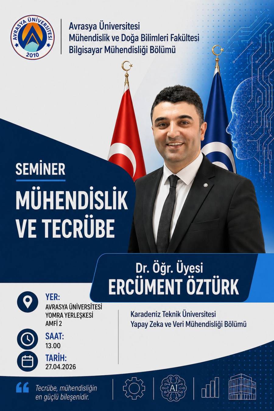 Avrasya Üniversitesi Mühendislik ve Doğa Bilimleri Fakültesi, Bilgisayar Mühendisliği Bölümü tarafından düzenlenen "Mühendislik ve Tecrübe" başlıklı seminer, 27 Nisan tarihinde Yomra Yerleşkesi Amfi 2'de başarıyla tamamlandı.