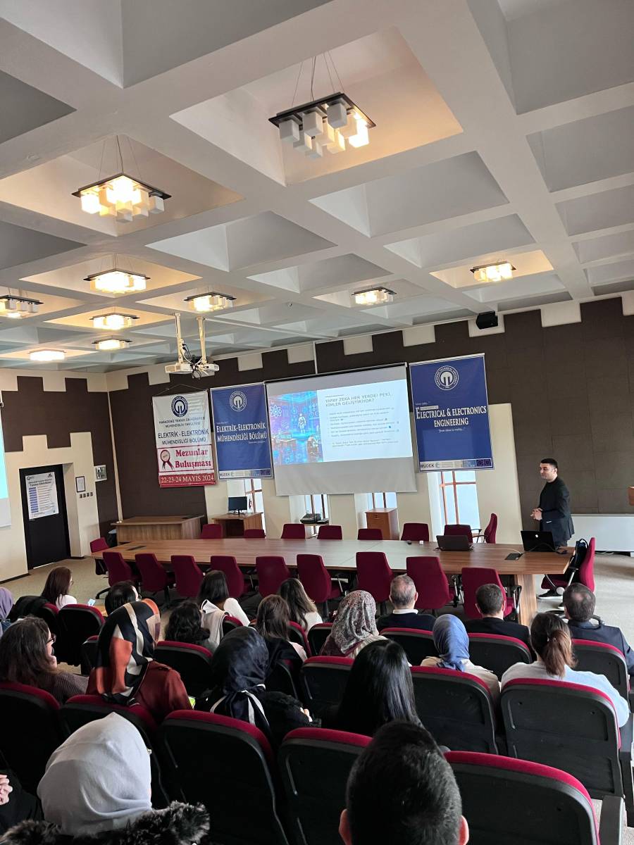 Programın devamında Yapay Zekâ ve Veri Mühendisliği Bölümümüz Dr. Öğr. Üyesi Ercüment ÖZTÜRK tarafından yapılan sunumda; bölümün akademik yapısı, uygulamalı eğitim süreçleri, laboratuvar altyapısı, sanayi iş birlikleri ve mezunlara yönelik kariyer olanakları hakkında detaylı bilgiler aktarıldı. Sunumun tamamlanmasının ardından Mühendislik Fakültesi Dekanı Prof. Dr. Temel VAROL tarafından katılımcılara teşekkür konuşması yapıldı.