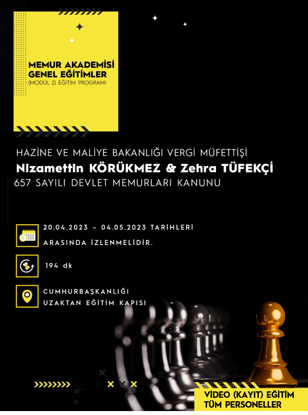 Hazine ve Maliye Bakanlığı Vergi Müfettişleri Nizamettin KÖRÜKMEZ ve Zehra TÜFEKÇİ tarafından Cumhurbaşkanlığı İnsan Kaynakları Ofisi (CBİKO) Uzaktan Eğitim Sistemi aracılığıyla 657 Devlet Memurları Kanunu video (kayıt) eğitimi olarak gerçekleştirilecektir.