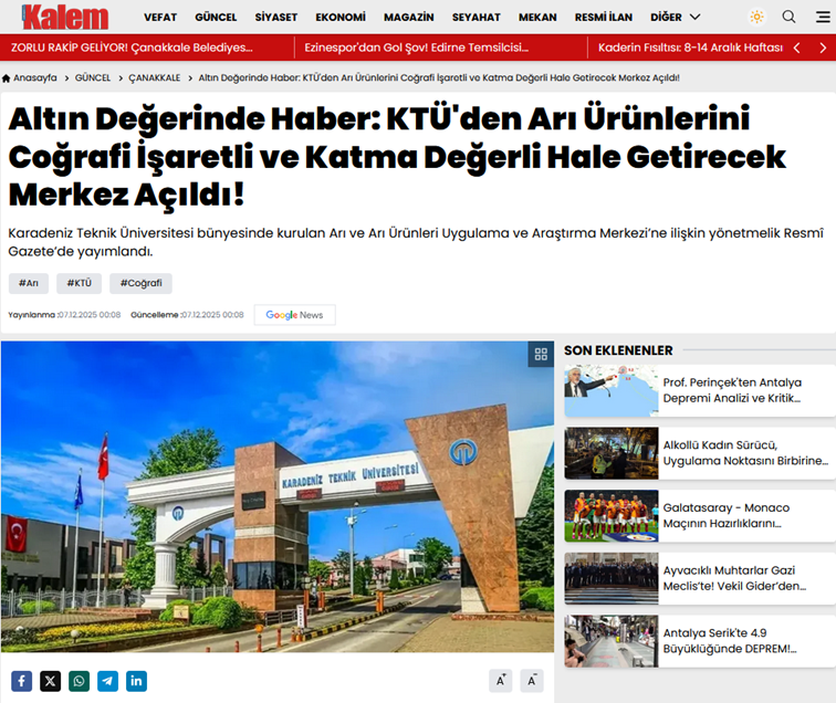 KTÜ Arı ve Arı Ürünleri Uygulama ve Araştırma Merkezi’nin (APİMER) kuruluşu, yerel ve ulusal düzeyde farklı gazete ve yayın organlarında yer buldu. Merkezin kuruluş sürecine ilişkin haberler, basın aracılığıyla kamuoyuna aktarılırken, APİMER’in arı ve arı ürünleri alanında yürütmeyi hedeflediği çalışmalar da genel hatlarıyla paylaşılmıştır. APİMER olarak, kuruluş sürecimize gösterilen ilgi ve desteğin, merkezin tanınırlığına ve faaliyetlerinin daha geniş kitlelere ulaşmasına katkı sağlayacağı değerlendirilmektedir.