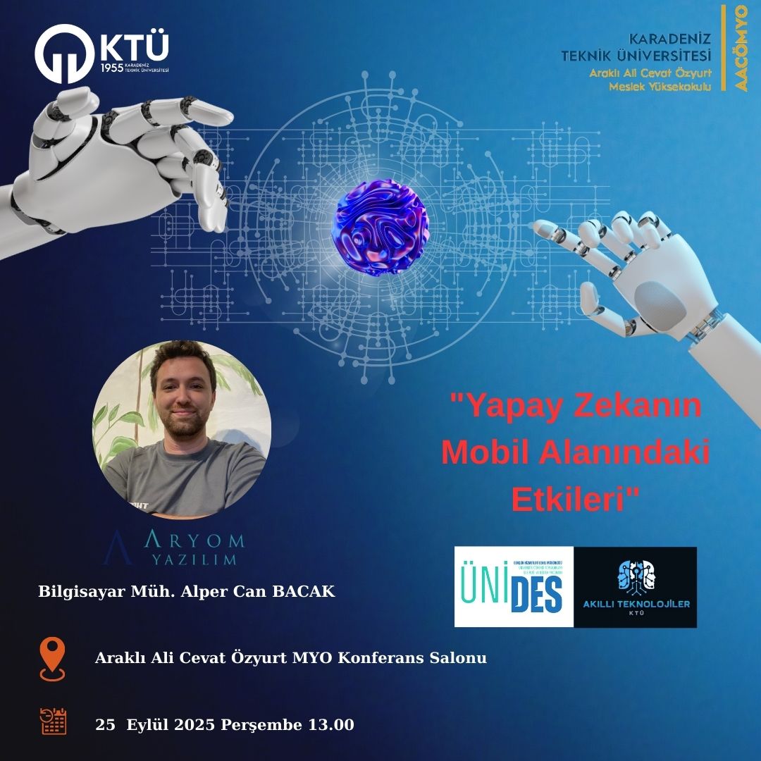 Akıllı Teknolojiler Kulübü öğrencilerinin T.C. Gençlik ve Spor Bakanlığı Üniversite Öğrenci Toplulukları İş Birliği ve Destek Programı (ÜNİDES) "Yapay Zekanın Mobil Alanındaki Etkileri" isimli projeleri kabul olmuştur. Bu proje kapsamında 25 Eylül 2025 Perşembe günü saat:13:00 da Aryom Yazılım'dan Alperen Can BACAK'ın katılımıyla konferans yapılacaktır. Bütün öğrencilerimiz davetlidir.