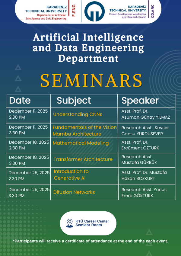 Our department continues its seminars in the field of Artificial Intelligence at full speed this semester as well. In these seminars, prepared by the faculty members of the Artificial Intelligence and Data Engineering Department and appealing to various areas of interest, the topics will be explained comprehensively along with the necessary mathematical details.