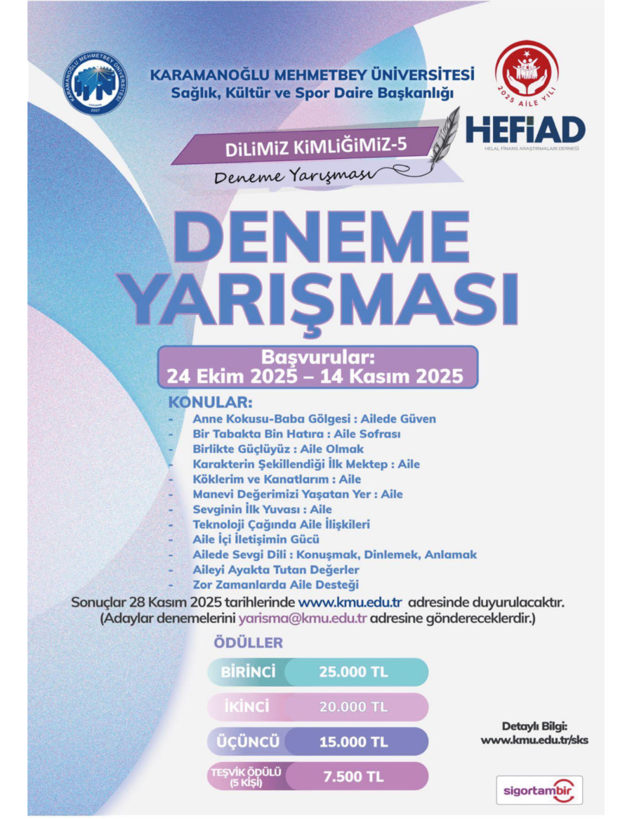 Karamanoğlu Mehmetbey Üniversitesi ile HEFİAD iş birliğinde, Türkiye’deki tüm üniversite öğrencileri (ön lisans, lisans ve yüksek lisans) arasında “En Kıymetli Hazinemiz: Aile” konulu ödüllü deneme yarışması düzenlenecektir.