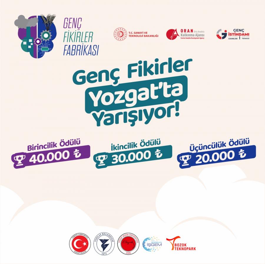 Yozgat Valiliği, Yozgat Belediyesi ve Orta Anadolu Kalkınma Ajansı tarafından organize edilen Yozgat Bozok Üniversitesi, Bozok Teknopark ve Sorgun İŞGEM tarafından desteklenen “Genç Fikirler Fabrikası” iş fikri yarışması ile Türkiye’de ticari değer taşıyan, gençlere istihdam olanağı sağlayabilecek yenilikçi iş fikirleri olan genç girişimci bireylerin veya takımların iş fikirlerini Yozgat’ta hayata geçirmelerinin teşvik edilmesi amaçlanmaktadır. Bu yarışma sonucunda sunulan iş fikirleri arasından en başarılı olanları bağımsız jüri tarafından seçilerek, bir prototipe dönüştürülmesi için malzeme ve hizmet alımları kalemlerinde finans desteği sağlanacaktır. Ayrıca başarılı bulunan girişimci adaylarına İŞGEM veya Bozok Teknopark’ta firmalarını kurmak ve girişimlerini başlatmak istemeleri halinde gerekli destekler sunulacaktır. Yarışma detaylarına https://www.gencfikirlerfabrikasi.com adresinden ulaşılabilmekte ve başvurular bu web sitesi üzerinden çevrimiçi olarak alınmaktadır.