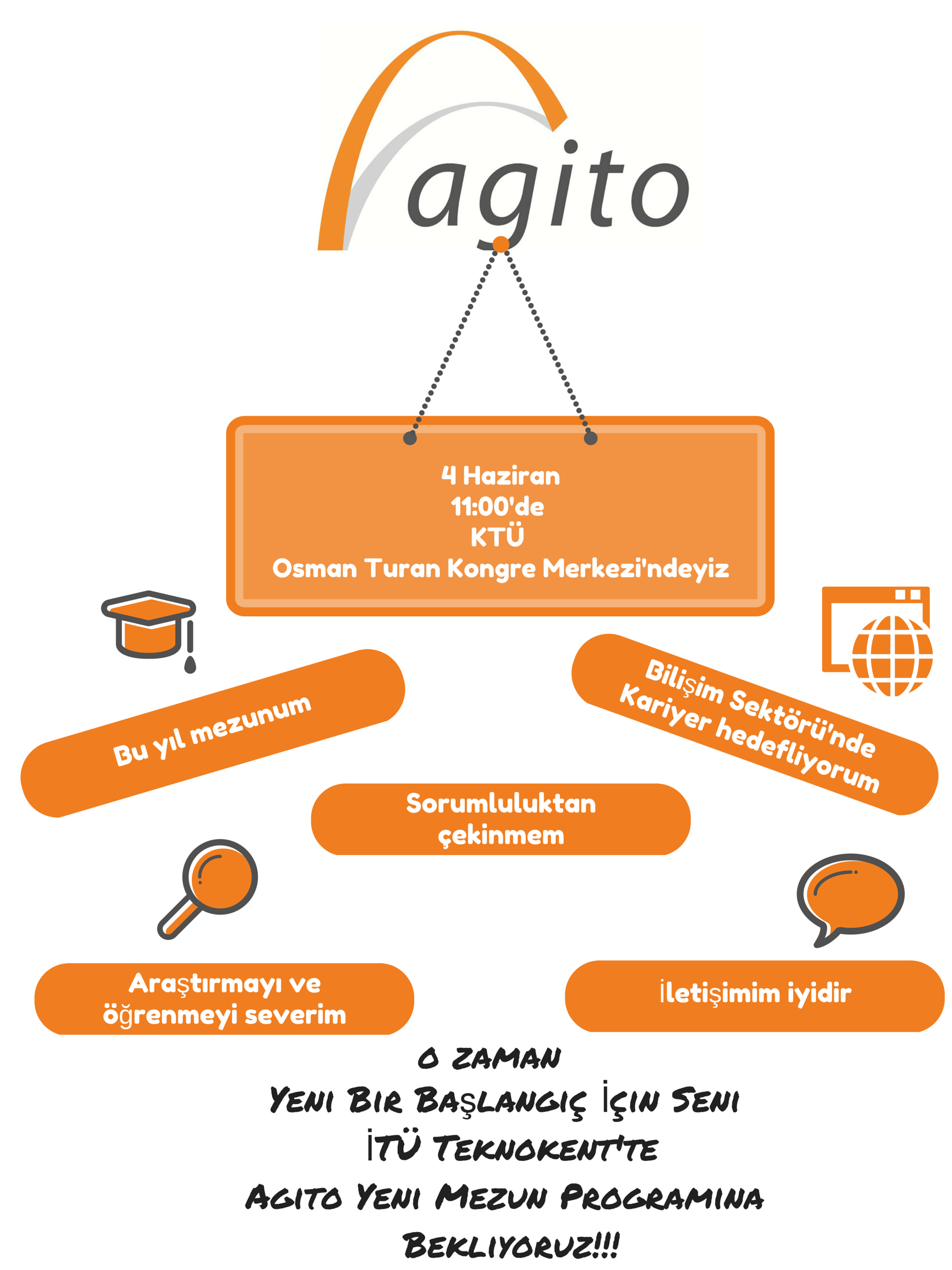 Kariyer geliştirme kapsamında bölümümüzü ziyaret edecek olan İTÜ Teknokent'te faaliyet gösteren Agito firması 4 Haziran Perşembe günü saat 11:00'de Osman Turan Kültür ve Kongre Merkezinde "Agito - Yeni Mezun Programı" adlı bir sunum gerçekleştirecektir.