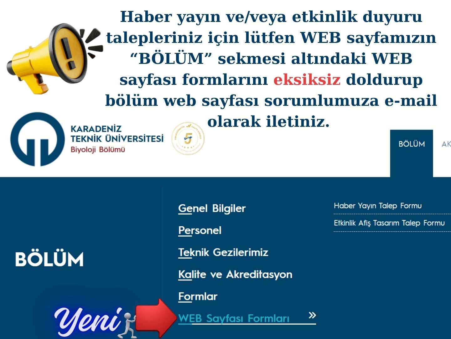 - 09.03.2026 Bölümümüz Web Sayfasında yayın akışının iyileştirilmesi kapsamında iki(2) yeni form (Haber Yayın Talep Formu ve Etkinlik Afiş Tasarım Formu) hazırlanarak bölümümüz WEB sayfasına eklenmiştir.
